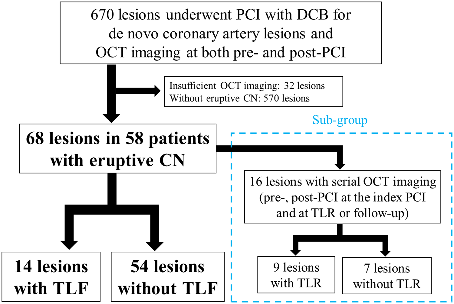 Study flow chart. Of the 670 de novo coronary artery lesions that were treated with OCT-guided PCI with DCB, 68 lesions were enrolled from 58 patients with eruptive CN, and TLF events occurred in 14 lesions. In the subgroup of 16 lesions with serial OCT imaging (pre-and post-PCI at the index PCI and at TLR or follow-up), TLR occurred in nine lesions. PCI, percutaneous coronary intervention; DCB, drug-coated balloon; OCT, optical coherence tomography; CN, calcified nodule; TLF, target lesion failure; TLR, target lesion revascularization.