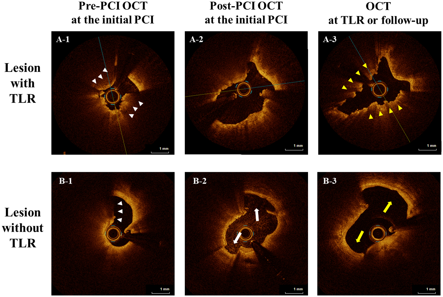 We quantitatively and qualitatively evaluated the pre- and post-PCI OCT findings at the index PCI for all lesions and serial OCT findings at TLR or follow-up for subgroups. The minimum lumen area (MLA) and area stenosis were evaluated for all lesions. On pre-PCI OCT, the lipid arc was defined as the circumferential extent of lipid material imaged as a signal-poor region diffusely bordered by overlying signal-rich bands corresponding to a fibrous cap (22). Calcium level was defined as a signal-poor or heterogeneous region with a sharply delineated border. The maximum arc of the target lesion calcium was measured in degrees by using a protractor centered on the lumen. The maximum calcium thickness was also measured (23). The maximum eruptive CN arc angle was assessed in the frame displaying the greatest eruptive CN arc angle, not including calcified protrusion or calcific sheet, in the lesion. Eruptive CN length was measured from the proximal to distal ends within the lesion as reported previously (24). In this study, CN implied only eruptive CN, defined as a lesion with fibrous cap disruption and a luminal thrombus associated with eruptive dense calcific nodules (3, 25). Post-PCI OCT was used to assess the presence of coronary artery dissections (26). Axial injury of the dissection was described as intimal involvement of the coronary dissection, where only the intima was affected and the media was still intact, as medial involvement if it extended into the media without disruption of the entire medial layer, and as adventitial involvement when the media was dissected throughout its thickness. Additionally, the maximum and longitudinal dissection angles were assessed. Suboptimal lumen expansion was defined as lesions with both post-PCI MLA <3.00 mm2 and expansion ratio (post-PCI MLA/mean reference lumen area) <0.50 at the index PCI (11). In the subgroup analysis, we investigated the presence or absence of underlying plaque morphology, as reported previously (11): CN protrusion, layered plaque, thrombus, and residual coronary artery dissection at TLR or follow-up. A CN protrusion was defined as a calcified nodule protruding into the lumen (27) and a layered plaque was defined as a different optical intensity with a clear demarcation from the underlying plaque (28). Late lumen enlargement (LLE) was defined as the MLA being larger during the follow-up period than post-PCI at the index (29).
