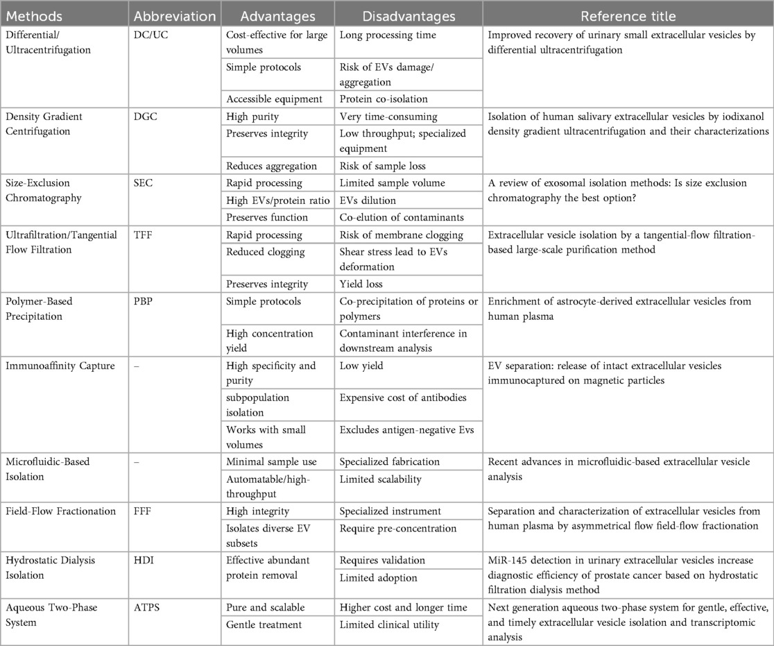The isolation and enrichment of EVs constitute a critical prerequisite for their clinical application as diagnostic biomarkers and therapeutic agents (Table 1). Current mainstream separation techniques include ultracentrifugation (UC), density gradient ultracentrifugation, size-exclusion chromatography (SEC), ultrafiltration (UF), polymer-based precipitation, field-flow fractionation, and immunoaffinity capture (IA). Studies have demonstrated that polymer-based precipitation and size-exclusion chromatography yield the highest total EV production (18). Notably, asymmetric flow field-flow fractionation (AsFlFFF/AF4) has emerged as a promising technique for isolating EVs subpopulations (19). Microfluidic platforms and combinatorial multi-step approaches also exhibit unique potential in this field. Given the inherent biological complexity, source heterogeneity, and functional diversity of EVs, integrated separation strategies are generally considered optimal (20). Current technical challenges primarily involve exogenous contamination, laborious operational procedures, and standardization deficiencies, necessitating the development of novel separation-enrichment systems with enhanced purity and efficiency. For the distinct sources discussed herein, common EV isolation methods are as follows, Serum/plasma commonly employs UC or SEC (21). Urine frequently uses UF combined with SEC or polymer-based precipitation (22). Tissue-derived EVs require initial enzymatic digestion/homogenization, followed predominantly by density gradient ultracentrifugation. Stem cell supernatant often relies on UC, polymer-based precipitation, or SEC. Milk typically favors SEC or optimized density gradient ultracentrifugation (23). Plant-derived EVs mainly depend on differential centrifugation combined with density gradient centrifugation (24). Combinatorial approaches (e.g., UC + SEC) are widely adopted to enhance purity and yield for specific sources, and emerging technologies like microfluidics show promise for advancing EV isolation (25). Optimizing source-specific isolation strategies remains a key research priority.
