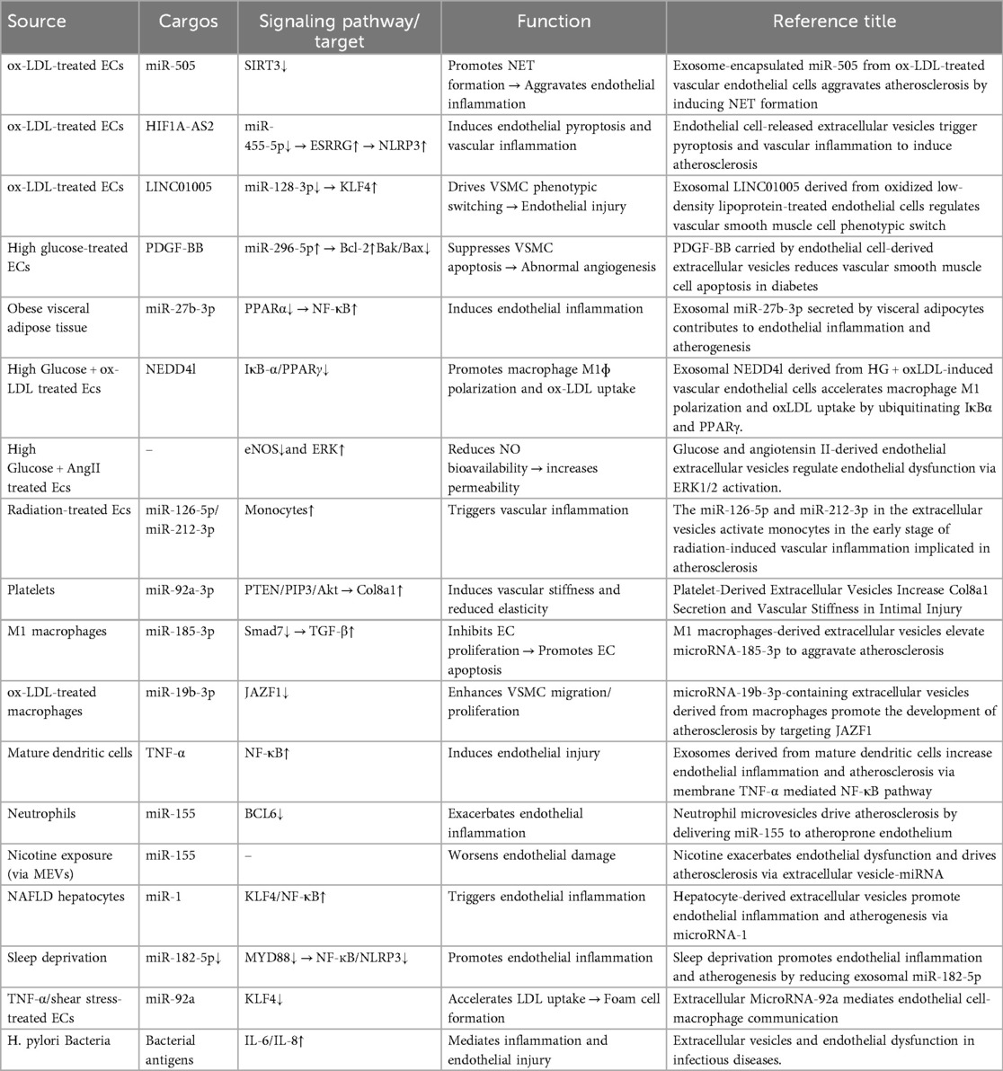 Steatotic hepatocyte-derived EVs promote endothelial inflammation by mediating miR-1-induced KLF4 pathway suppression and NF-κB pathway activation (75). Human aortic stenotic valve-derived extracellular vesicles can lead to endothelial dysfunction, pro-adhesive and procoagulant responses via the AT1R/NADPH oxidase/sodium-glucose cotransporter 2 (SGLT2) pro-oxidative pathway (76). Extracellular vesicles derived from human induced pluripotent stem cell-derived endothelial cells (hiPSC-ECs) reduce endothelial cell apoptosis and restore autophagy, suggesting that EV-based therapies offer a promising avenue for targeting endothelial dysfunction in similar vascular pathologies (77). During Helicobacter pylori infection, bacterium-derived EVs deliver bacterial antigens into vascular endothelial cells, mediating inflammation and endothelial injury (64). Notably, milk-derived EVs enriched with miR-30b-5p have been implicated in cardiovascular and metabolic diseases by modulating inflammation and oxidative stress. This miRNA suppresses TLR4 activity in endothelial cells, downregulates pro-inflammatory molecules, and thereby attenuates atherosclerotic progression (78). In atherosclerosis, EVs derived from heterogeneous cellular sources can pathologically exacerbate endothelial damage and procoagulant responses, while therapeutically attenuating apoptosis and restoring autophagic homeostasis.