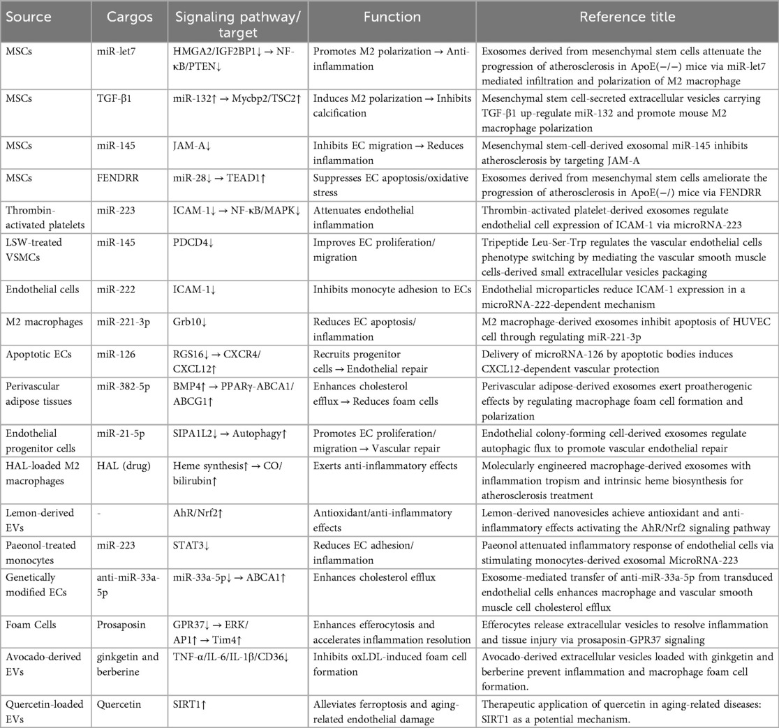 During the development of atherosclerosis, following endothelial dysfunction, the next significant contributor to AS is foam cell formation. Under the influence of various adhesion and chemotactic factors, monocytes adhere to the damaged vascular endothelium, migrate across the vascular wall, and transform into macrophages. Macrophages can uptake erythrocyte-derived extracellular vesicles via endocytosis (50). Under inflammatory stimulation, their cargo heme can attenuate the ability of ox-LDL-treated macrophages to form foam cells. Foam cell-derived EVs express prosaposin, which binds to macrophage GRP37, increasing the expression of the efferocytosis receptor Tim4 through activation of the ERK-AP1 signaling axis (51). This leads to enhanced macrophage efferocytosis efficiency and accelerated inflammation resolution. Exosomes (BMDM-IL-4-exo) produced by bone marrow-derived macrophages (BMDMs) exposed to the M2-polarizing cytokine IL-4 contain abundant miR-99a/146b/378a (52). These exosomal miRNAs inhibit inflammation by targeting NF-κB and TNF-α signaling and further promote M2 polarization in recipient macrophages. Under high glucose induction, extracellular vesicles released by bone marrow cell-derived macrophages increase the number of circulating hematopoietic and myeloid cells. This leads to an increased macrophage population, exacerbating vascular inflammation and promoting atherosclerosis progression. Under nicotine stimulation, EVs derived from monocytes are secreted abundantly. These EVs encapsulate miR-155, which induces endothelial cell dysfunction and vascular inflammation by targeting BCL2, MCL1, TIMP3, BCL6 and activating the NF-κB pathway (53). During atherosclerosis progression, foam cell formation represents a pivotal pathological stage following endothelial dysfunction, wherein macrophages differentiated from migrated monocytes regulate inflammation and foam cell dynamics via EVs uptake; EVs derived from diverse cellular sources and their miRNA cargo exert bidirectional modulation, either resolving inflammation or exacerbating vascular damage through targeted signaling cascades, collectively driving disease advancement.