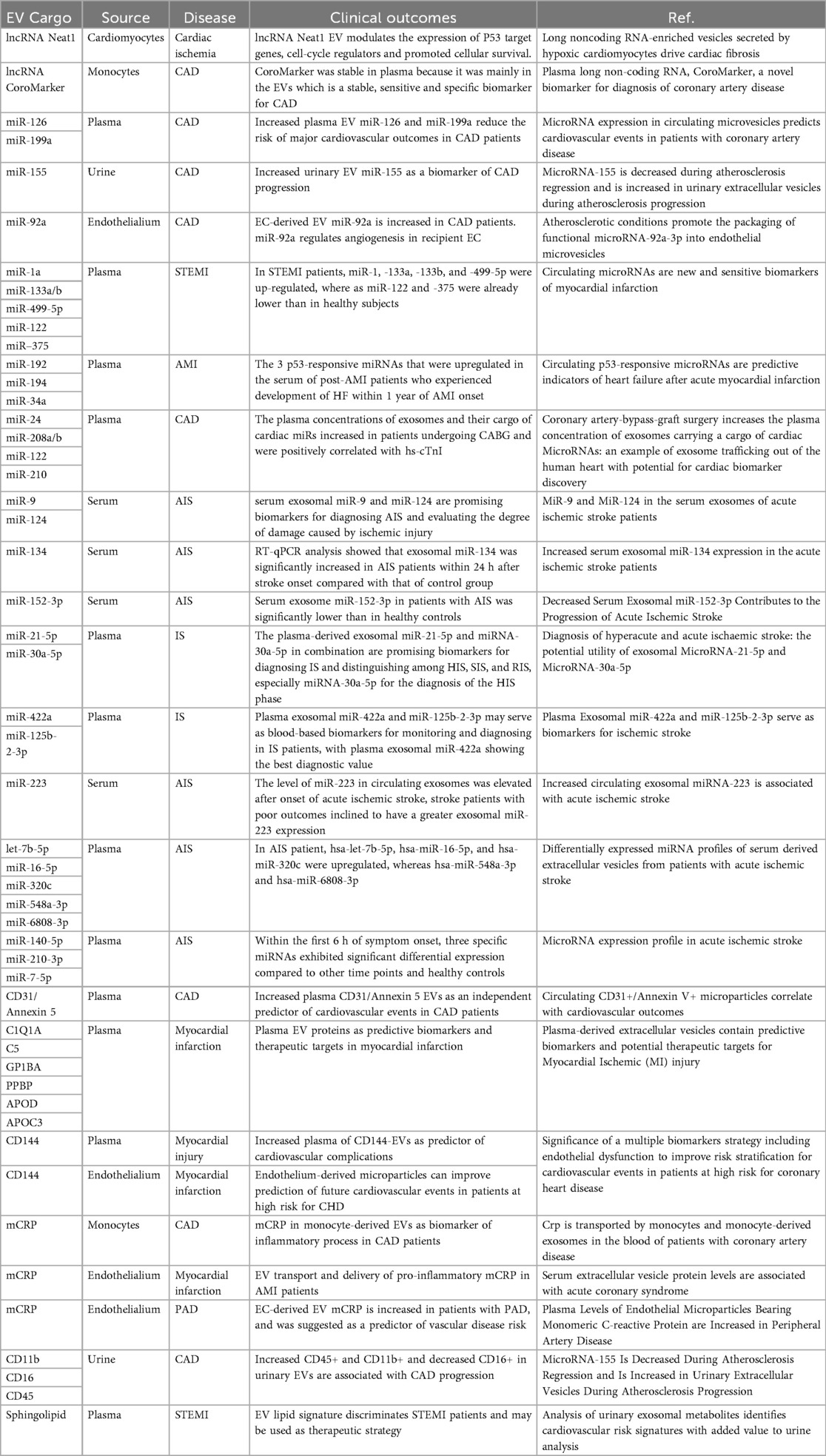 Currently, the standard biomarkers for myocardial infarction (MI) are high-sensitivity cardiac troponins, including cTn-I and cTn-T (107). Although highly effective in the clinical setting for diagnosing MI, high-sensitivity troponins focus solely on AMI diagnosis and not on prediction and early warning. Therefore, finding new biomarkers is necessary, as early diagnosis of MI is associated with improved outcomes for future MI development. EVs have garnered considerable interest as novel blood biomarkers (Table 4). EVs have become important diagnostic tools for ischemic heart disease (IHD) patients because they can be easily enriched in large quantities from bodily fluids, and their diverse cargo is resistant to degradation (108). The cargo of EVs reflects the true metabolic state of the originating cardiomyocytes. Studies have indicated that after acute myocardial infarction (AMI), compared to the control group, EVs in the blood of the AMI group are larger in size, with elevated circulating levels of CD144 but decreased levels of CCR6 and CXCR3 (109). Simultaneously, compared to peripheral blood after AMI, coronary artery blood showed a significant decrease in CCR6 levels. Multiple experiments have demonstrated that a hypoxic environment promotes cardiomyocyte secretion of EVs. Using surface antigen CD172a as a specific marker for cardiomyocyte-derived EVs, both in vitro and in vivo experiments showed that hypoxia increases EV yield (110). Small extracellular vesicles circulating in ST-segment elevation myocardial infarction (STEMI) reflect the severity of myocardial injury in patients (111). By analyzing monocyte transcriptome data, a strong positive correlation was observed between PKIG and naïve B cells in AMI-monocyte-derived exosomes, RPL23 monocyte-derived exosomes showed a positive correlation, and OST4 potentially interacts with the p53 signaling pathway to mediate cardiomyocyte apoptosis (112). Through analysis of EVs in postmortem body fluids, significantly elevated levels of miR-486-5p were found in patients with high-grade atherosclerotic plaques, suggesting its potential as a biomarker for diagnosing acute myocardial infarction triggered by coronary atherosclerosis, including within the forensic field (113). Proteomic profiling of urinary EVs revealed reduced expression levels of UMOD protein in CAD patients' urinary EVs, this study contributes to the future use of uEVs as an emerging biomarker for the early, non-invasive diagnosis of CAD through protein differentials (114). Proteomic identification of plasma exosomes also revealed differences in the types and levels of protein expression in both STEMI and NSTEMI (115). Analysis of human plasma small extracellular vesicles (sEVs) using surface-enhanced Raman scattering (SERS) measurement technology combined with various machine learning methods demonstrated high sensitivity and specificity, suggesting that interdisciplinary fusion provides a promising strategy for non-invasive, safe, and high-precision early detection of CAD (116). Transcending the limitations of conventional MI biomarkers, EVs leverage their cellular origin specificity and molecular stability to redefine the paradigms of early warning, precise diagnosis, and dynamic monitoring in acute coronary syndromes through multi-omics dimensions.