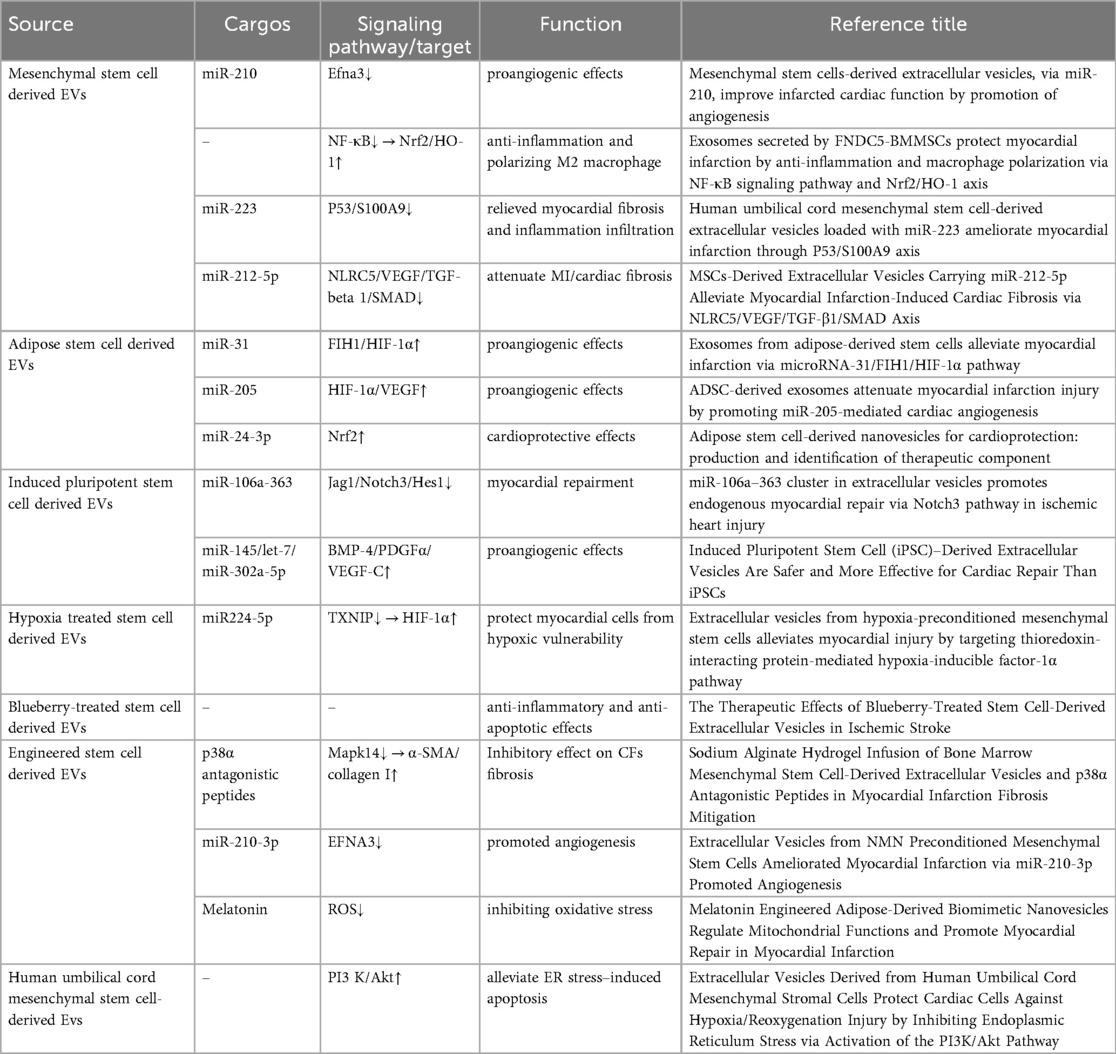 The EV-based regenerative toolkit is reshaping post-injury myocardial functional restoration through synergistic engineered delivery strategies and endogenous repair mechanisms (Table 5). Hypoxia and tumor necrosis factor-alpha (TNF-α) modulate extracellular vesicle release from human induced pluripotent stem cell-derived cardiomyocytes, this research aids in developing novel pharmacological strategies for MI (77). Extracellular vesicles from pluripotent stem cells or specially processed endogenous human serum exert cardioprotective effects post-injury (134). Mesenchymal stem cell-derived EVs (MSC-EVs) can rescue myocardial I/R injury by inducing cardiomyocyte autophagy via the AMPK and Akt pathways, reducing apoptosis and myocardial infarct size while improving cardiac function (135). Culturing MSC-EVs using a hollow fiber bioreactor-based three-dimensional (3D) system yields higher quantities with similar biological functions compared to traditional two-dimensional (2D) culture (136). Monocyte mimics confer stronger recruitment characteristics to MSC-EVs in I/R models through Mac1/LFA1-ICAM-1 adhesion molecule interactions, enhancing their targeting efficiency to injured myocardium and improving EV delivery to ischemic-damaged myocardium (137). Exosomes derived from adipose stem cells (ASC-Exos) promote angiogenesis in ischemic hindlimbs and hearts in mice by delivering miR-31 via the miR-31/FIH1/hypoxia-inducible factor-1α (HIF-1α) signaling pathway, alleviating ischemic heart disease (138). ASC-Exos-delivered miR-205 significantly reduced cardiomyocyte apoptosis while promoting angiogenesis and microvascular endothelial cell proliferation to improve cardiac function after myocardial infarction (139). Adipose stem cell-derived exosomal miR-196a-5p and miR-425-5p prevented ischemia-induced mitochondrial dysfunction and reactive oxygen species (ROS) production in cardiomyocytes, increased angiogenesis, and polarized macrophages towards the anti-inflammatory M2 immunophenotype (140). Furthermore, miR-196a-5p reduces and reverses myofibroblast activation and lowers collagen expression to inhibit myocardial fibrosis. ASCs-EVs-miR-221 significantly enhanced proliferation and expression of anti-apoptotic proteins in H9C2 cells (a cardiomyocyte cell line derived from the left ventricle of Sprague Dawley rats) (141). Plasma-derived extracellular vesicles from myocardial infarction patients inhibited TNF-α-induced cardiomyocyte death by suppressing TNF-α expression. yREX3 alleviates myocardial ischemic injury through selective DNA methylation (142). The non-coding RNA yREX3 encapsulated within EVs mediates the epigenetic silencing of the protein interacting with C kinase 1 (Pick1) via methylation of upstream CpG sites by triggering widespread transcriptomic changes in macrophages. Simultaneously, yREX3 interacts with polypyrimidine tract-binding protein 3 (PTBP3) to methylate the Pick1 gene locus. Inhibiting Pick1 in macrophages enhances Smad3 signaling and boosts exocytosis, thereby minimizing cardiac necrosis in rats with myocardial infarction. The neonatal mammalian heart possesses the ability to regenerate after injury by inducing cardiomyocyte proliferation. Experiments demonstrated that EVs from regenerating neonatal mouse heart tissue after apical resection surgery (AR-Neo-EVs) exhibited stronger pro-proliferative, anti-apoptotic, and pro-angiogenic activities compared to EVs from neonatal mouse heart tissue (Neo-EVs) (143). Subsequent studies confirmed that delivering AR-Neo-EVs via sodium alginate hydrogel microspheres is an effective method for treating myocardial infarction. Conversely, vesicles derived from myocardial tissue of postnatal day 8 mice (P8-EVs) significantly promoted M1-like macrophage polarization, enhanced phagocytosis, and influenced macrophage factor secretion by activating the Pak2-Erk1/2 axis, thereby inhibiting neonatal cardiomyocyte proliferation. Human amniotic fluid stem cell-derived EVs demonstrated potential for cardiomyocyte renewal (144). It shows that stem cell derived EVs offer enhanced translational potential as delivery vehicles for myocardial regeneration therapy by improving cardiac targeting, coordinating multiple repair pathways, and preserving bioactive molecule stability.