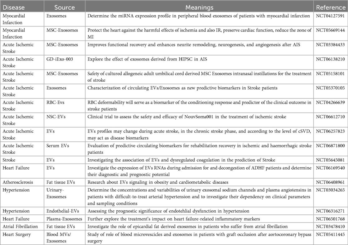 Over the last five years, EVs have emerged as promising biomarkers and therapeutic agents in cardiovascular disease owing to their ability to reflect the state of the parent cell and modulate regenerative processes. Their potential has been investigated across a wide spectrum of CVDs such as myocardial infarction, heart failure, ischemia/reperfusion injury, stroke, and atherosclerosis. A growing number of clinical trials have been initiated to explore the translational value of EVs.