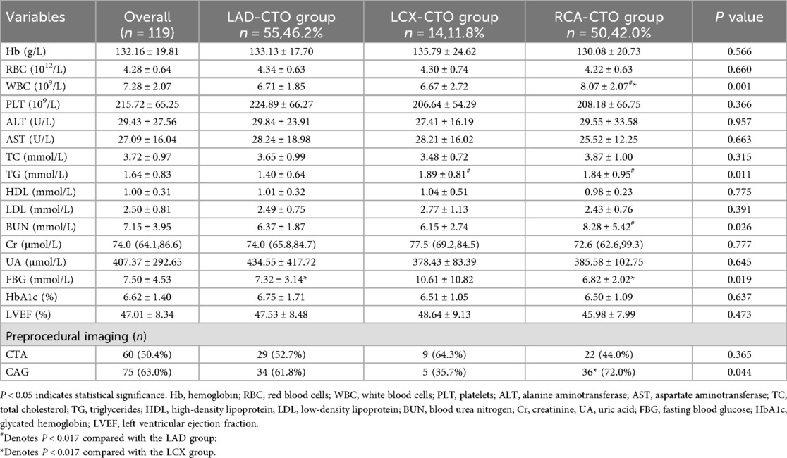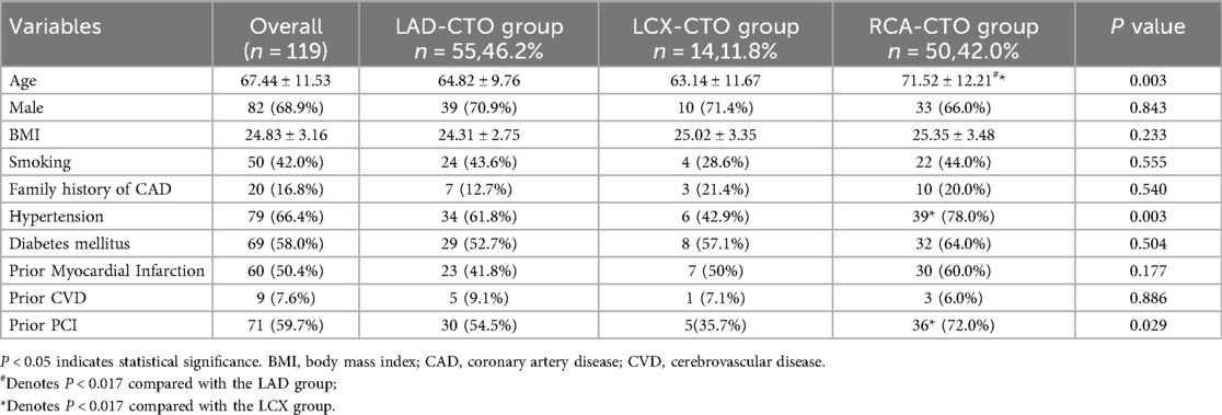 A total of 119 patients were included in this study. Among them, 55 patients were in the LAD-CTO group, 14 in the LCX-CTO group, and 50 in the RCA-CTO group. Baseline characteristics are shown in Table 1. We report p-values for all variables; Bonferroni adjustment was applied only to post-hoc pairwise comparisons. As shown in Figure 1a, there was a significant difference in age among the three groups (P = 0.003). The mean age in the RCA-CTO group was 71.52 ± 12.21 years old, which was significantly higher than that in the LAD-CTO group (64.82 ± 9.76) and the LCX-CTO group (63.14 ± 11.67). In addition, although no statistically significant difference in sex distribution was observed among the three groups (P = 0.843), the overall population was predominantly male (68.9%), consistent with the epidemiological pattern that CTO is more commonly observed in men (13). Hypertension was present in 79 patients (66.4%), with significant differences among the three groups: 61.8% in the LAD-CTO group, 42.9% in the LCX-CTO group, and 78.0% in the RCA-CTO group (P = 0.003). There was no significant difference in the history of diabetes among the three groups (P = 0.540); however, the overall prevalence of diabetes was 58.0%, consistent with previous studies reporting a high prevalence of diabetes in patients with CTO (14). It is noteworthy that a significant difference was observed among the three groups in terms of prior PCI history (P = 0.029), with the highest proportion in the RCA-CTO group (72.0%) and the lowest in the LCX-CTO group (35.7%). This suggests that RCA-CTO lesions are more likely to be intervened upon or treated earlier, which may be related to differences in vascular anatomy, procedural complexity, and operator preference.