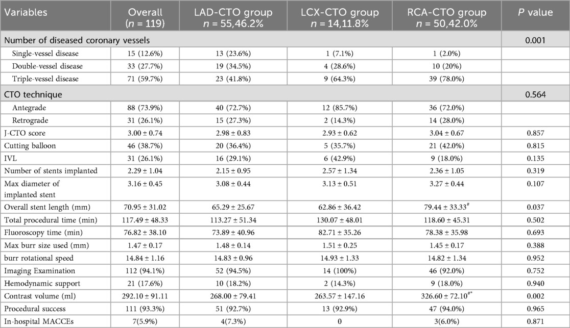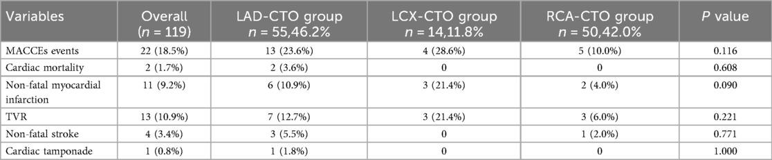 The mean J-CTO score of all CTO patients included in this study was 3.00 ± 0.74, indicating that the lesion complexity and difficulty of recanalization in all three groups reached a challenging level (16). Intravascular imaging techniques, including IVUS or OCT, were utilized in 94.1% of patients, which aligns with current interventional guidelines strongly recommending the use of intravascular imaging (17). During hospitalization, a total of 7 patients experienced procedure-related adverse events (Supplementary Table S1). In the LAD group, 4 events occurred, including one case each of vessel perforation, cardiac tamponade, urgent TVR, and acute cardiac decompensation. The RCA group had 3 events, including one case each of vessel perforation, cardiac tamponade, and acute cardiac decompensation. The overall incidence rate of 5.9% was lower than that reported in previous studies.