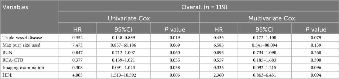 Covariates included in the analysis were age, sex, BMI, history of diabetes, history of hypertension, presence of triple-vessel disease, target vessel type (RCA vs. non-RCA), preoperative LVEF, Cr, BUN, hemoglobin, high-density lipoprotein (HDL), low-density lipoprotein (LDL), average number of stents implanted, total stent length, and use of intravascular imaging. A stepwise regression model was used for variable selection and analysis (Table 6). Cox regression included 16 covariates with 22 MACCE events; results should be interpreted as exploratory due to potential overfitting. Although differences in three-vessel disease, use of intravascular imaging, and HDL did not reach statistical significance (P = 0.079, P = 0.096, and P = 0.094, respectively), their observed directions are consistent with potential clinical relevance. However, given the limited sample size, these findings should be interpreted cautiously, and further studies with larger cohorts are needed to clarify their role in short-term prognosis.
