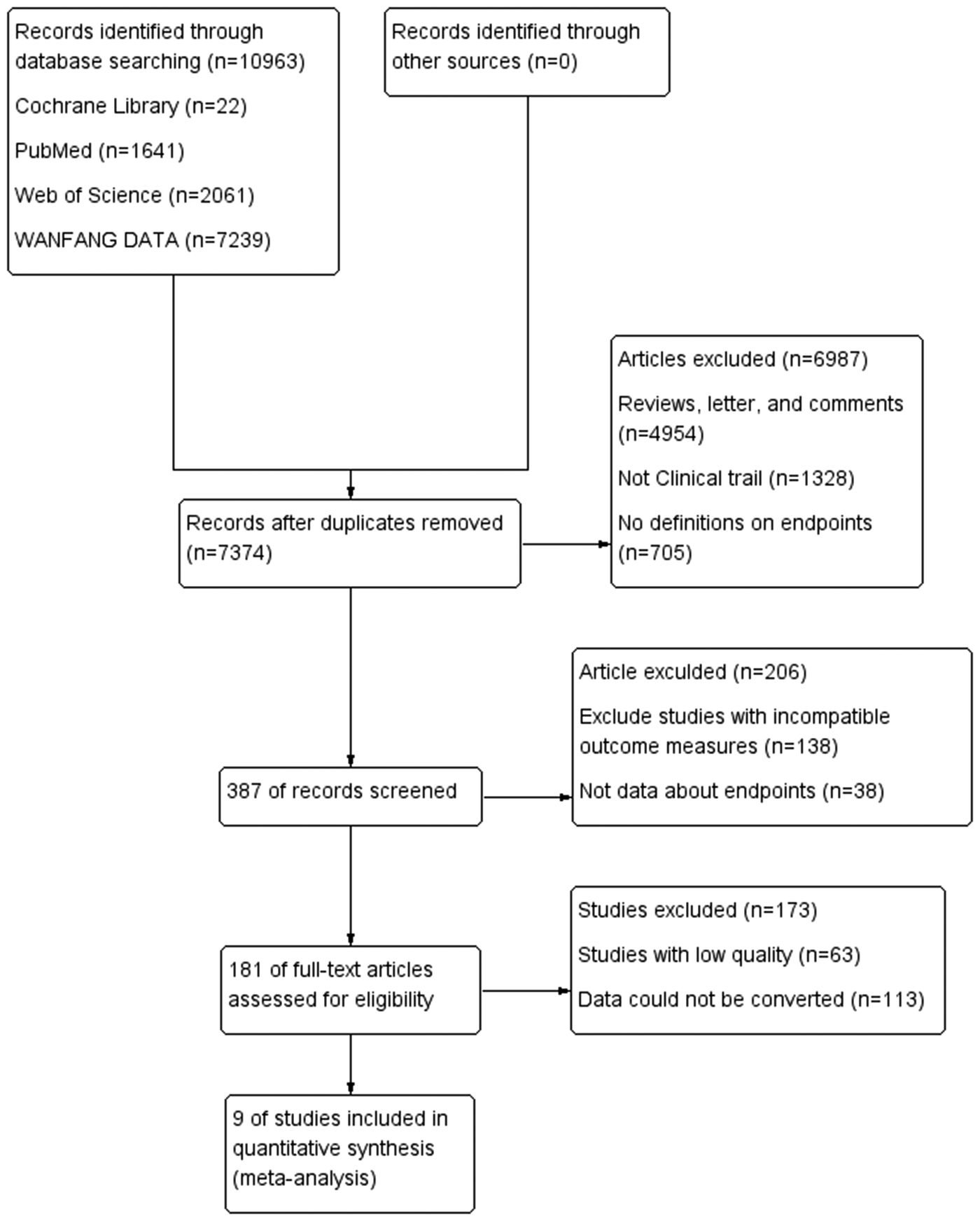 Per the flowchart, the system search generated 10,963 records from databases (Cochrane Library, PubMed, Web of Science, and WAMFANG). After removing duplicates, 7,374 records remained. Following exclusions of 4,954 records including reviews, letters, and comments, 1,328 non-process trials, and 705 records lacking endpoint definitions, 387 records were selected for full-text review. After excluding studies with incompatible outcome metrics, low-quality studies, and data conversion issues, 9 studies were ultimately included in the meta-analysis (Figure 1).