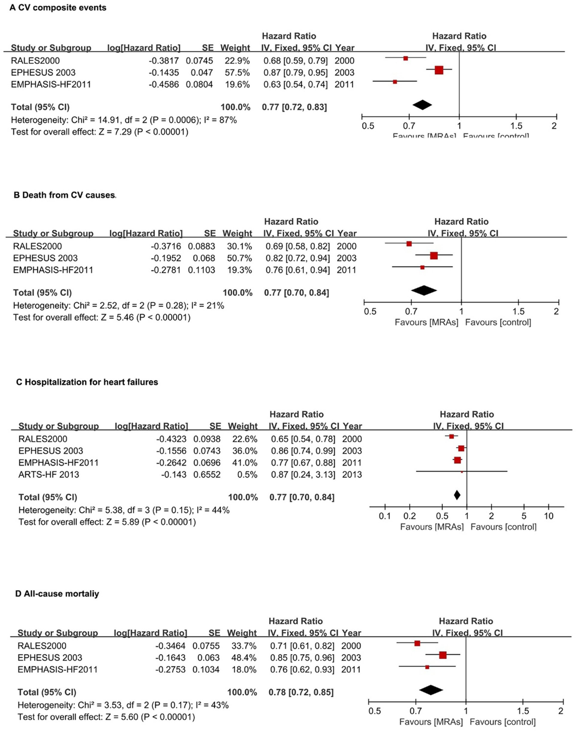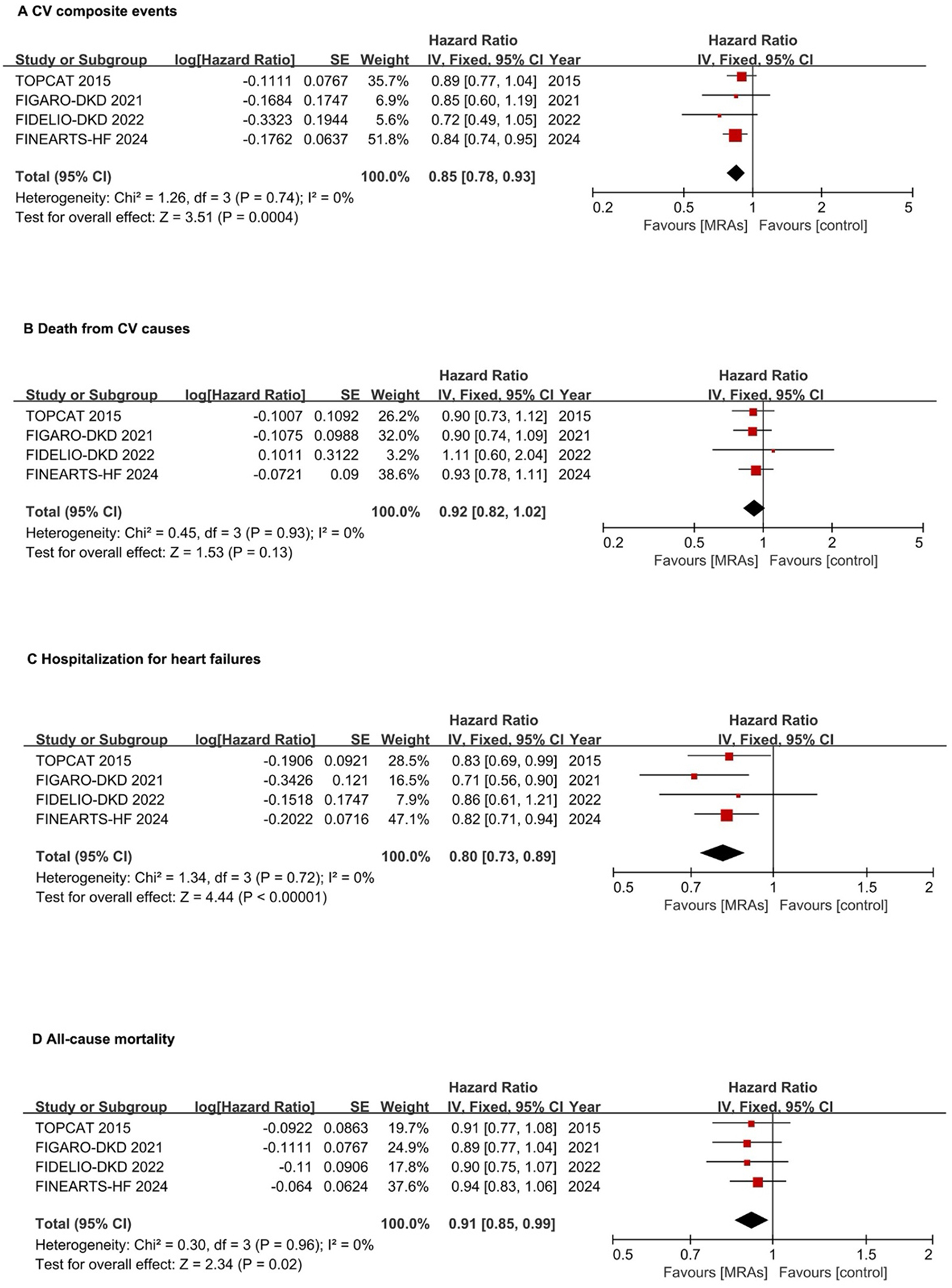 Forest plots assessing MRA effectiveness in hFrEF patients.(A) CV composite events; (B) CV death; (C) Hospitalization for heart failures; (D) All-cause mortality. CI, confidence interval; CV, cardiovascular; HFpEF, heart failure with preserved ejection fraction; HFrEF, heart failure with reduced ejection fraction; IV, inverse variance; MRA, mineralocorticoid receptor antagonists.
