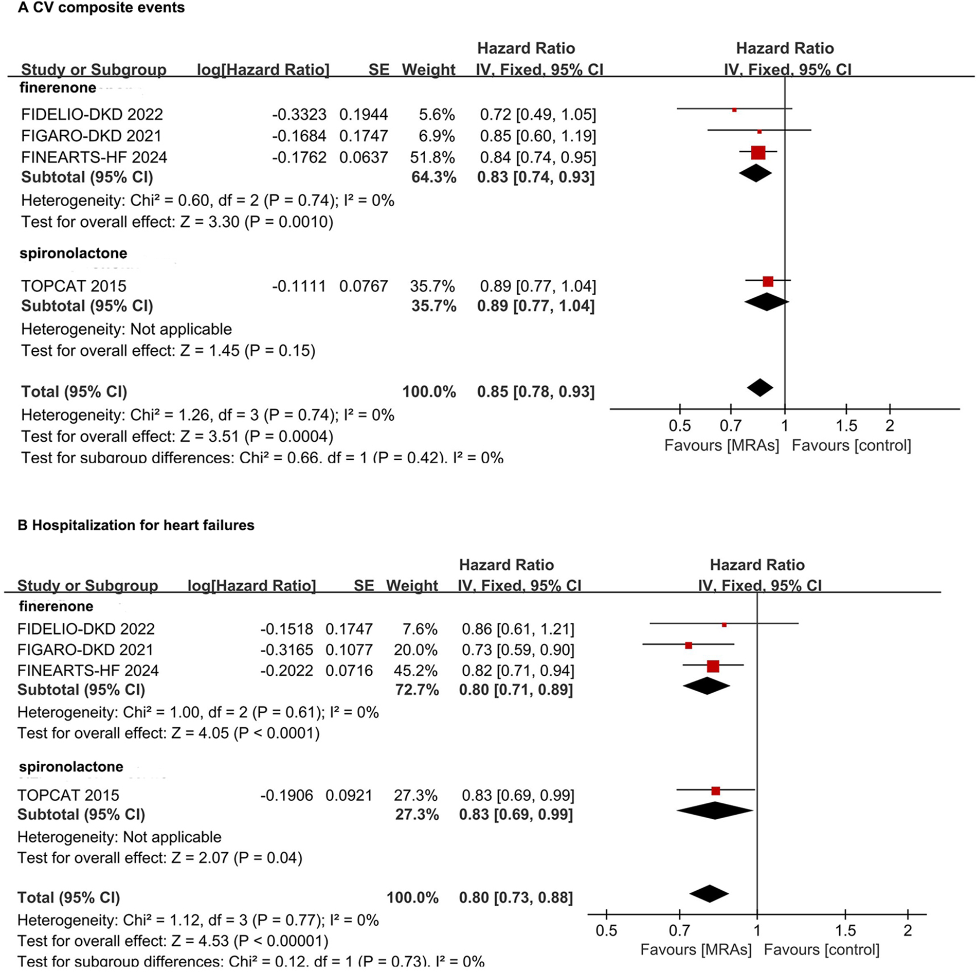 Subgroup analysis of non-steroidal MRA and steroidal MRA in hFpEF and hFmrEF patients. (A) CV composite events; (B) Hospitalization for heart failures. CI, confidence interval; CV, cardiovascular; HFpEF, heart failure with preserved ejection fraction; HFmrEF, heart failure with mildly reduced ejection fraction; IV, inverse variance; MRA, mineralocorticoid receptor antagonists.