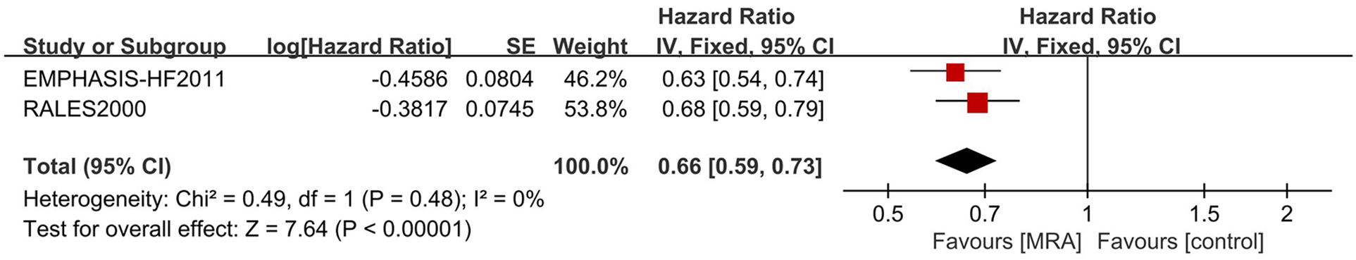For CV endpoints, a sensitivity analysis was executed. The exclusion of the EPHESUS trial culminated in a marked reduction in heterogeneity (I2 = 0). This outcome underscores the EPHESUS trial as the principal determinant of the heterogeneity (Figure 5).