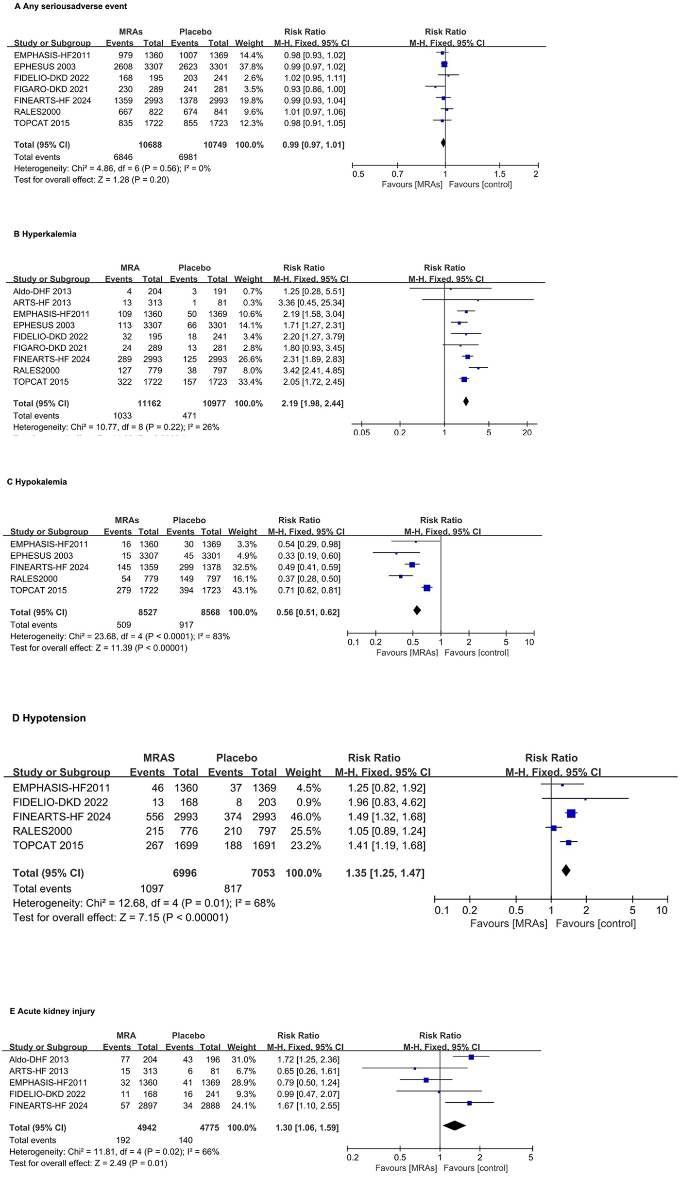The RR for any serious adverse event with MRAs vs. placebo is 0.99 (95% CI: 0.97–1.01; P = 0.20) without heterogeneity (Figure 6A). MRAs significantly increase the risk of hyperkalemia, with an RR of 2.19 (95% CI: 1.98–2.44; P < 0.00001) with mild heterogeneity (I2 = 26%) (Figure 6B). The RR for hypokalemia with MRAs is significantly reduced to 0.56 (95% CI: 0.51–0.62; P < 0.00001) with high heterogeneity (I2 = 83%) (Figure 6C). The risk of hypotension is significantly increased with MRAs (RR: 1.35, 95% CI: 1.15–1.47, P < 0.00001) with moderate heterogeneity (I² = 68%) (Figure 6D). The risk of acute kidney injury is significantly increased with MRAs (RR: 1.30, 95% CI: 1.06–1.59, P = 0.01) with moderate heterogeneity (I² = 66%) (Figure 6E).