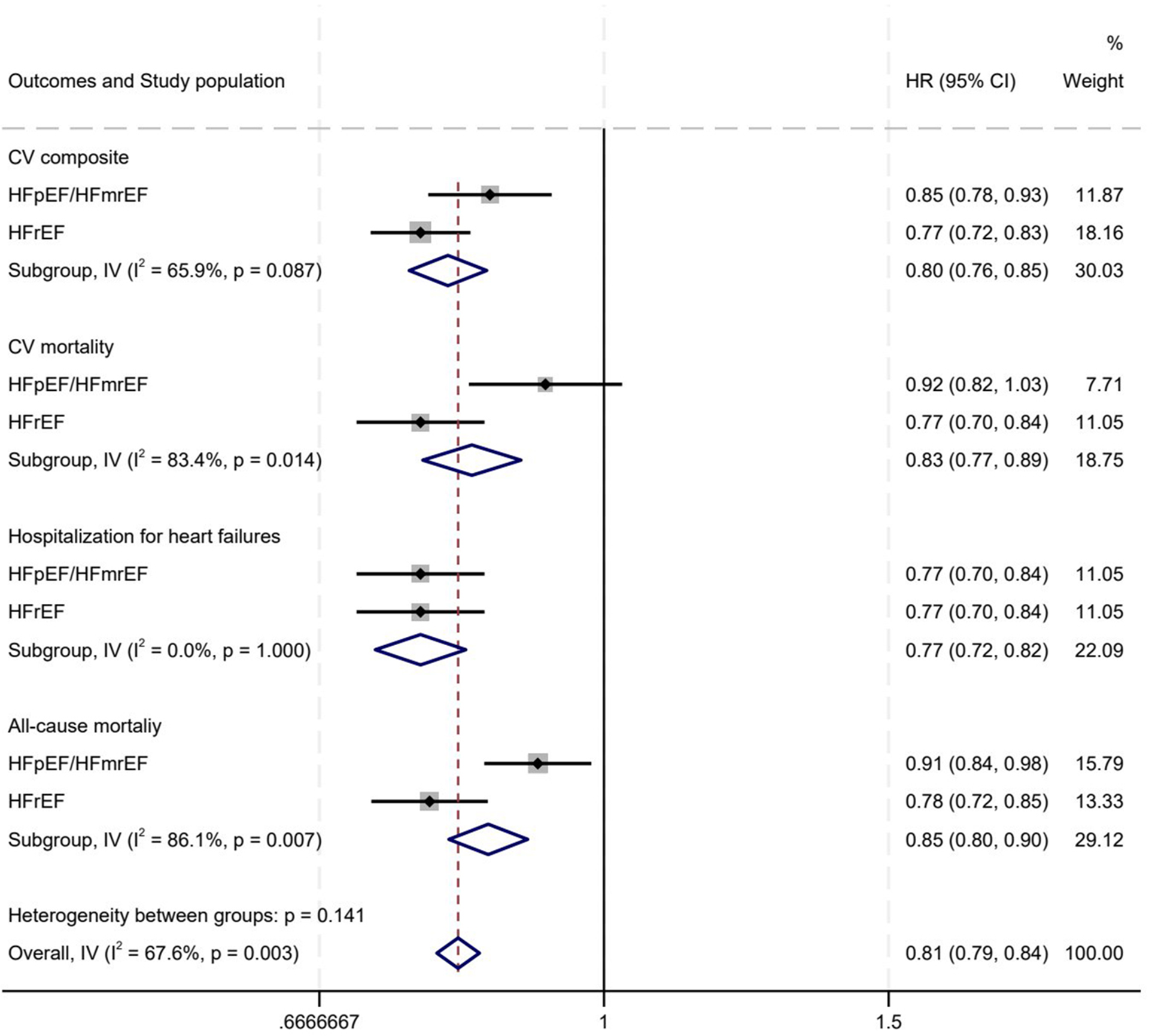 CV composite events (CV death or HHF), CV death, HHF |