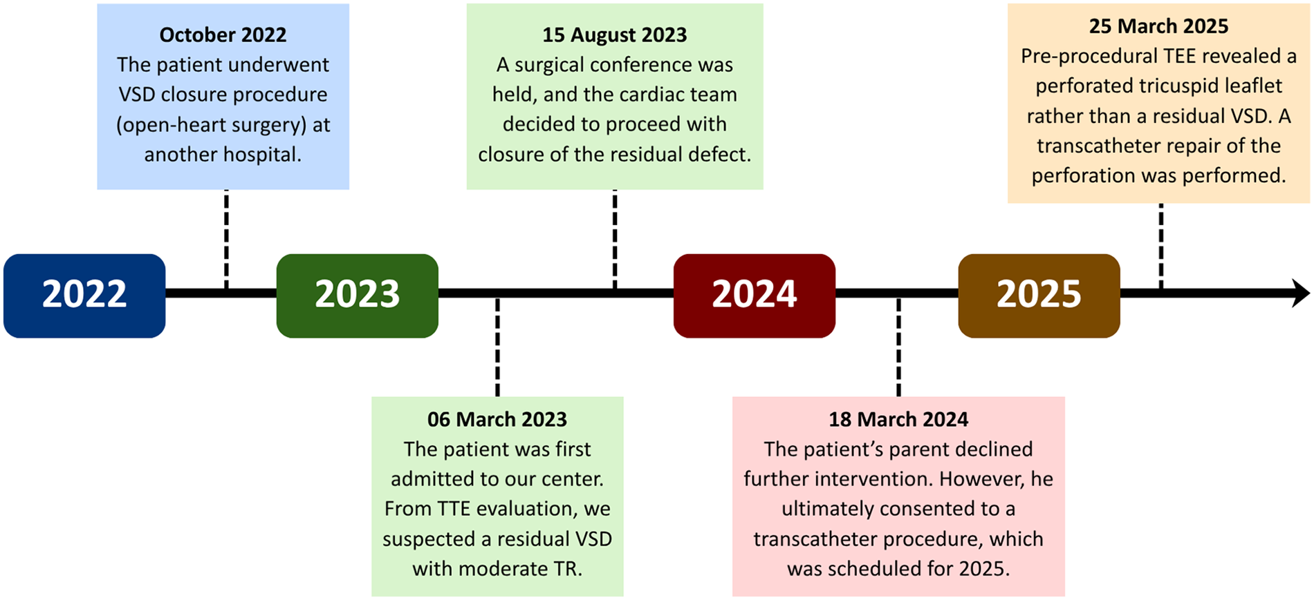 A 6-year-old male patient with a history of VSD closure in another hospital at the age of 3 years and 10 months (October 2022) was referred to our center in March 2023 for further evaluation of suspected residual VSD shunt and the possibility for a transcatheter closure. The patient was asymptomatic on admission, and was given a routine therapy of sildenafil 3 × 15 mg and ramipril 1 × 2.5 mg from the previous hospital. There was no prior history of fever or other signs alluding to infective endocarditis. At our center, transthoracic echocardiography (TTE) demonstrated a systolic jet flow directed towards the right atrium. This was initially suspected as tricuspid regurgitation; however, the possibility of a residual VSD could not be ruled out. A surgical conference was then carried out in August 2023 with the decision to evaluate the flow ratio, followed by a device closure. Upon further assessment, a tricuspid leaflet defect was discovered from pre-procedural transesophageal echocardiography (TEE), leading to a transcatheter repair of the valve. An overview of the patient's timeline of care is summarized in Figure 1.
