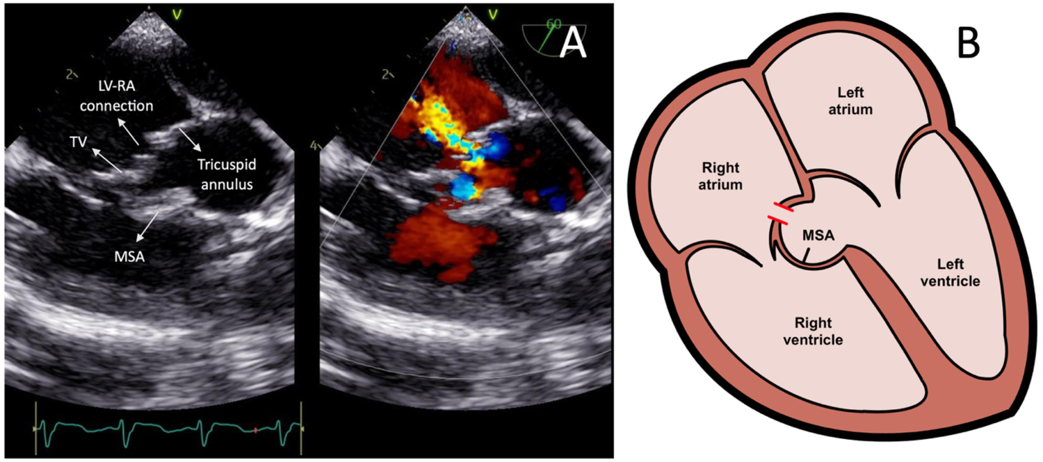 (A) Transesophageal echocardiography images showing the left ventricle-right atrium connection prior to the device closure. (B) Heart illustration representing the left ventricle-right atrium connection from the tricuspid valve leaflet defect and associated membranous septal aneurysm. LV-RA, left ventricle-right atrium; MSA, membranous septal aneurysm; TV, tricuspid valve.