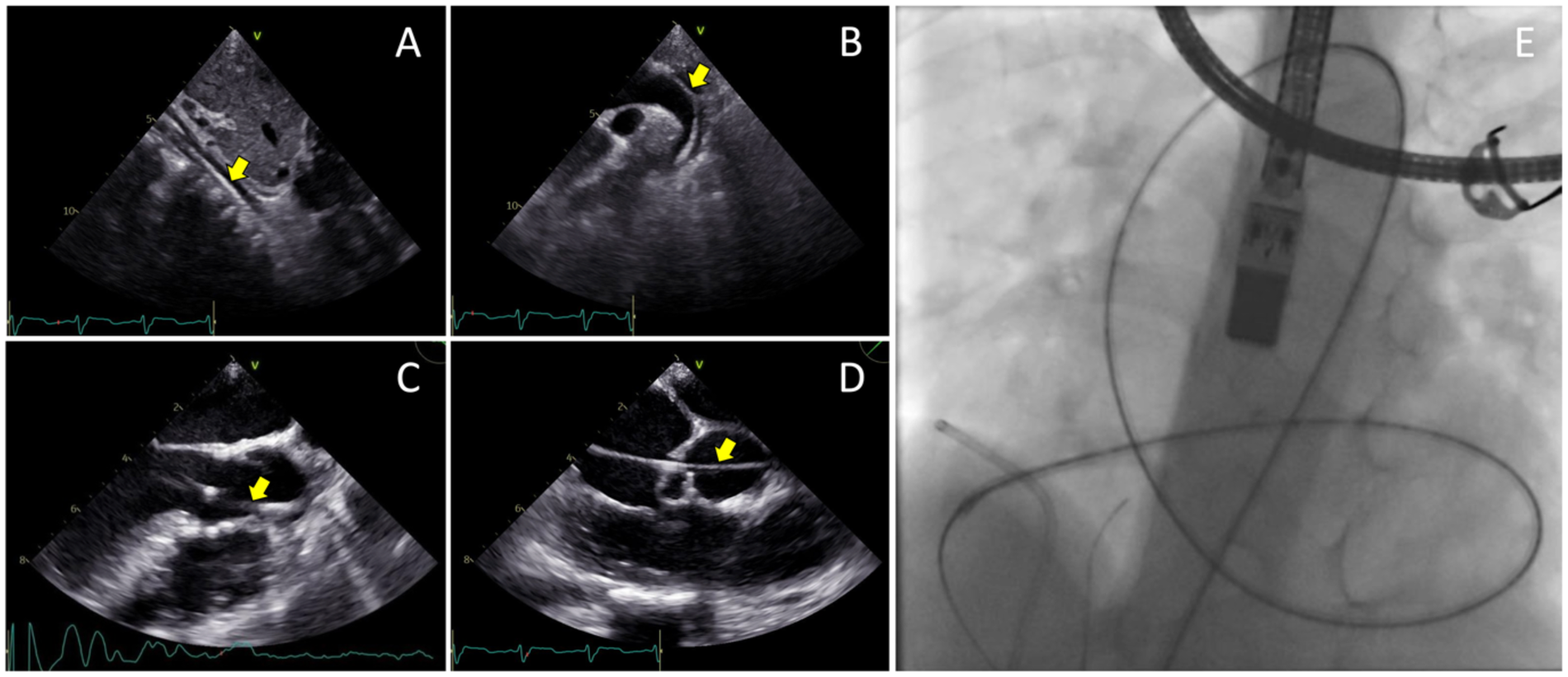 Transesophageal echocardiography views of the 0.035” soft hydrophilic wire (yellow arrows) being advanced from the femoral artery (A) into the abdominal aorta, (B) through the descending aorta and aortic arch, (C) into the left ventricle, (D) and crossing the tricuspid valve defect. (E) Fluoroscopy view of the Terumo wire after crossing the site of defect.