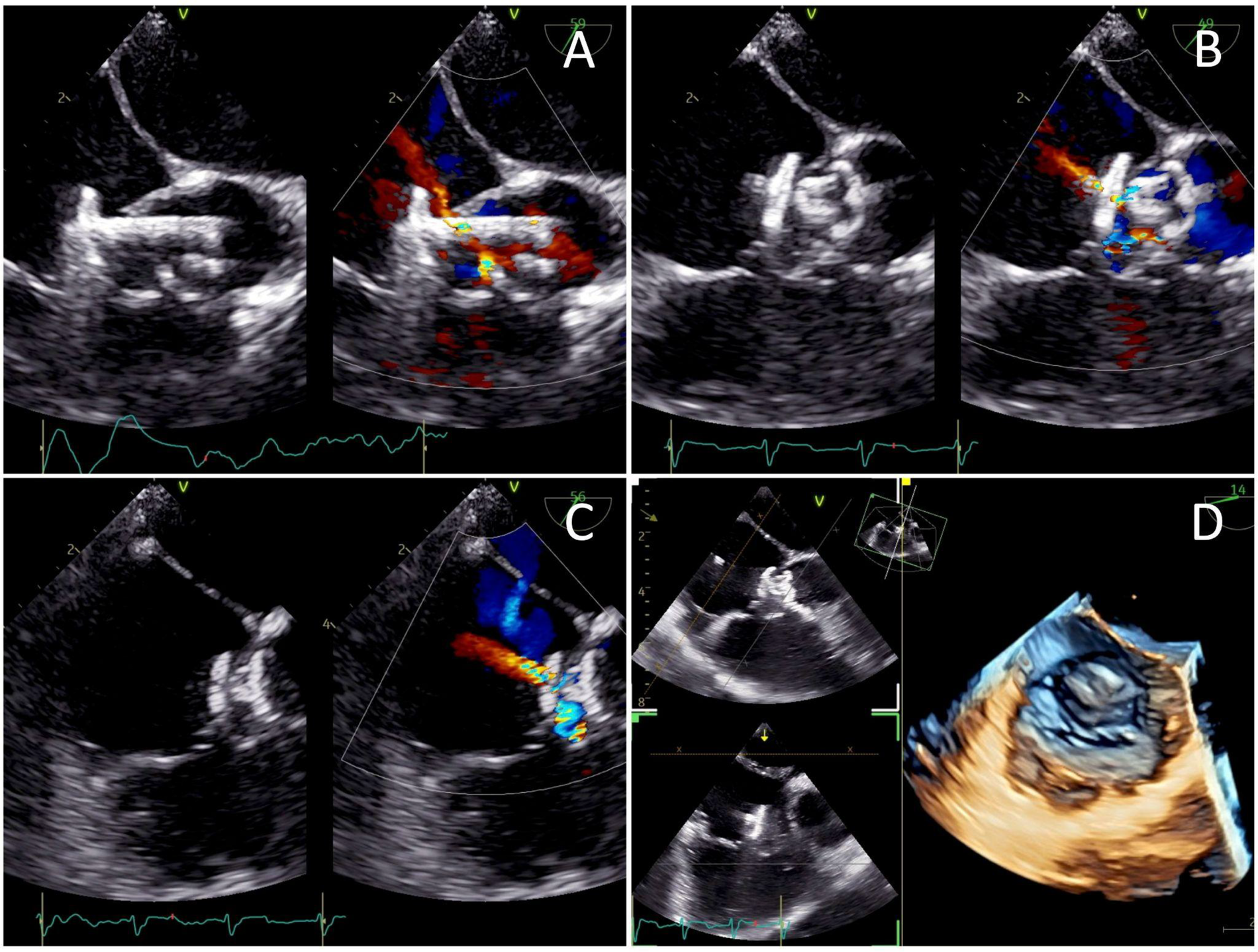 Transesophageal echocardiography views of (A) the low-pressured disc being deployed at the right atrium before the whole system was pulled into the tricuspid valve defect, (B) the high-pressured disc deployed at the left ventricle ends to seal the defect, and (C) a minimal residual central shunt with no peripheral leakage. (D) Post-procedure images demonstrating the device successfully sealing the defect.