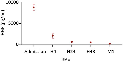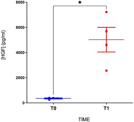 To assess the impact of heparin injection on HGF levels, we compared the levels in four patients from the cohort before and 30 min after the administration of heparin bolus, using blood samples collected before catheter insertion during transport to the hospital. We observed a significant increase in the HGF levels after heparin injection (from 356 ± 77 pg/mL at baseline to 5,026 ± 1,957 pg/mL at peak; p < 0.05, Figure 2), confirming that the observed HGF was indeed heparin-dependent.