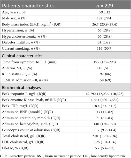 In the present analysis, 229 patients were included. The mean age of the patients was 59 ± 12 years, of whom 79.5% were male. The patients presented multiple risk factors with current smoking habit (59.7%), diabetes mellitus (14.8%), and hypertension (28.8%). The location of acute myocardial infarction was anterior in 51.5% of patients and 86% belonged to Killip class I at admission. Overall, 158 patients (69%) had a TIMI 0 coronary flow on invasive angiography (Table 1).