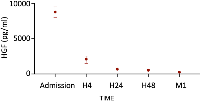 To evaluate the kinetics of heparin-induced HGF release, we measured HGF levels at five different time points following STEMI by using ELISA. We observed a major peak of HGF at hospital admission (8,750 pg/mL, IQR: 8,021–9,492). The levels then decreased rapidly within the first 4 h to reach a relatively stable level from H24 to 1 month (Figure 1). The HGF levels did not correlate with ischemia time, age, or creatinine levels at admission. In addition, the levels were comparable between males and females.