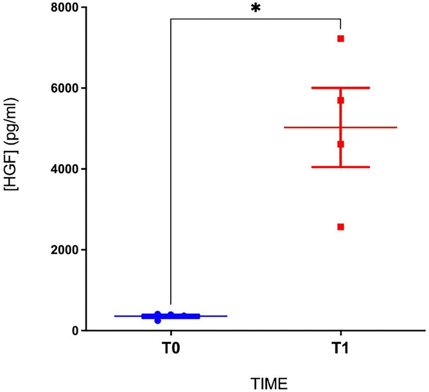 HGF levels before and after the bolus of heparin. T0, before heparin injection; T1, 30 min after the bolus of heparin (*p < 0.05; n = 4 patients).