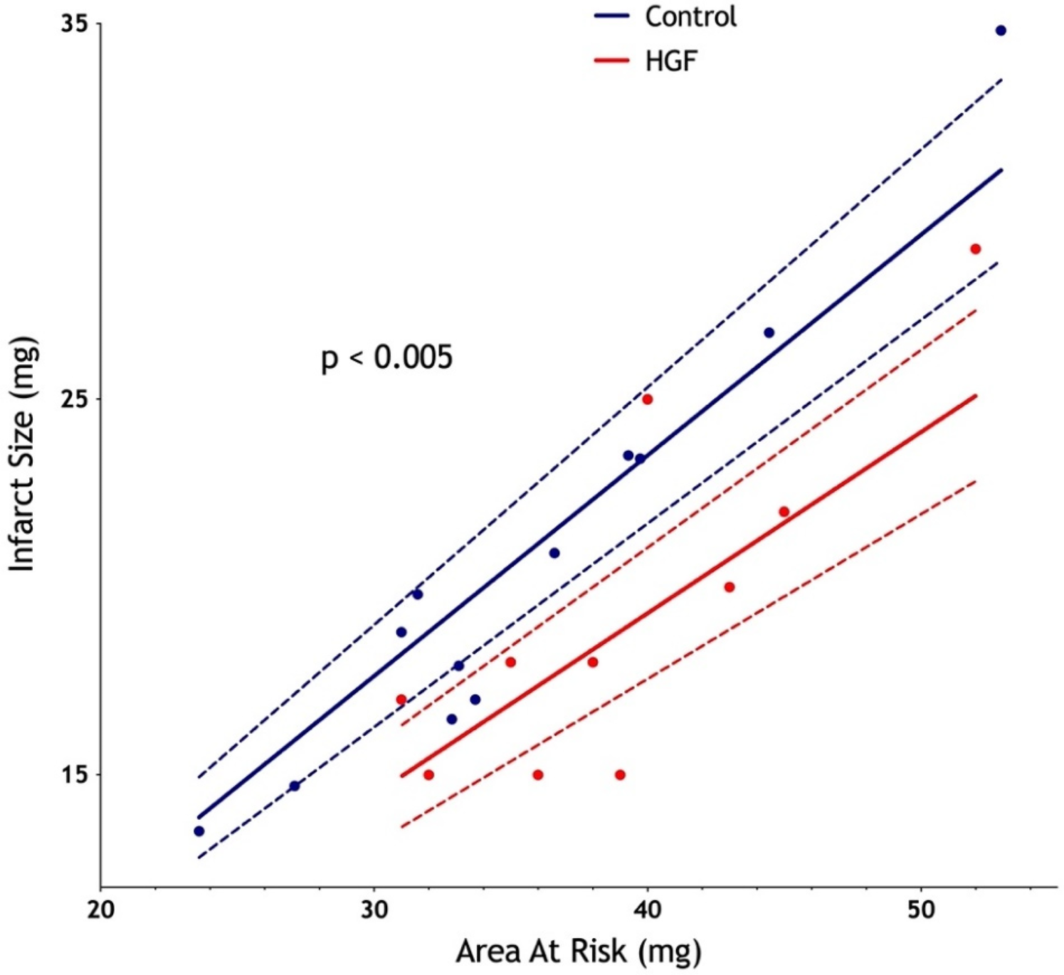 A Shapiro–Wilk test was performed to assess the normality of continuous variables. Depending on the distribution, data were presented as mean ± standard deviation for normally distributed variables or as median (interquartile range) for non-normally distributed variables. Group comparisons were performed using parametric tests (e.g., Student's t-test) or non-parametric tests (e.g., Mann–Whitney U test), as appropriate, based on the distribution of the data assessed by using the Shapiro–Wilk test. We compared the normalized infarct size between the control and the recombinant HGF groups using a linear regression model with the group as a categorical predictor. A p-value < 0.05 was considered significant. Statistical analyses were performed using GraphPad Prism 8.01.