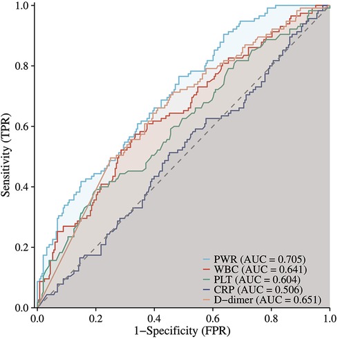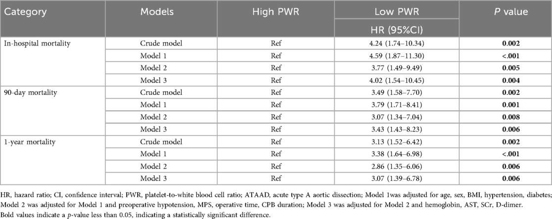 Recently, platelet-to-white blood cell ratio (PWR), a marker of systemic inflammatory response, has gained increasing recognition since its initial introduction by Toutouzas et al. It is derived by dividing the PLT by the WBC count and serves primarily as an index to quantify the inflammatory status of the host (18). Further studies have revealed its prognostic application in various pathological conditions, including prevalent chronic disorders (19, 20) and acute, life-threatening states (21, 22). Previous evidence has also linked preoperative PWR levels to 30-day mortality outcomes in patients undergoing surgery for ATAAD (23, 24). However, the relationship between PWR and the incidence of postoperative complications, as well as short- and intermediate-term mortality after ATAAD surgery, has not been fully elucidated.