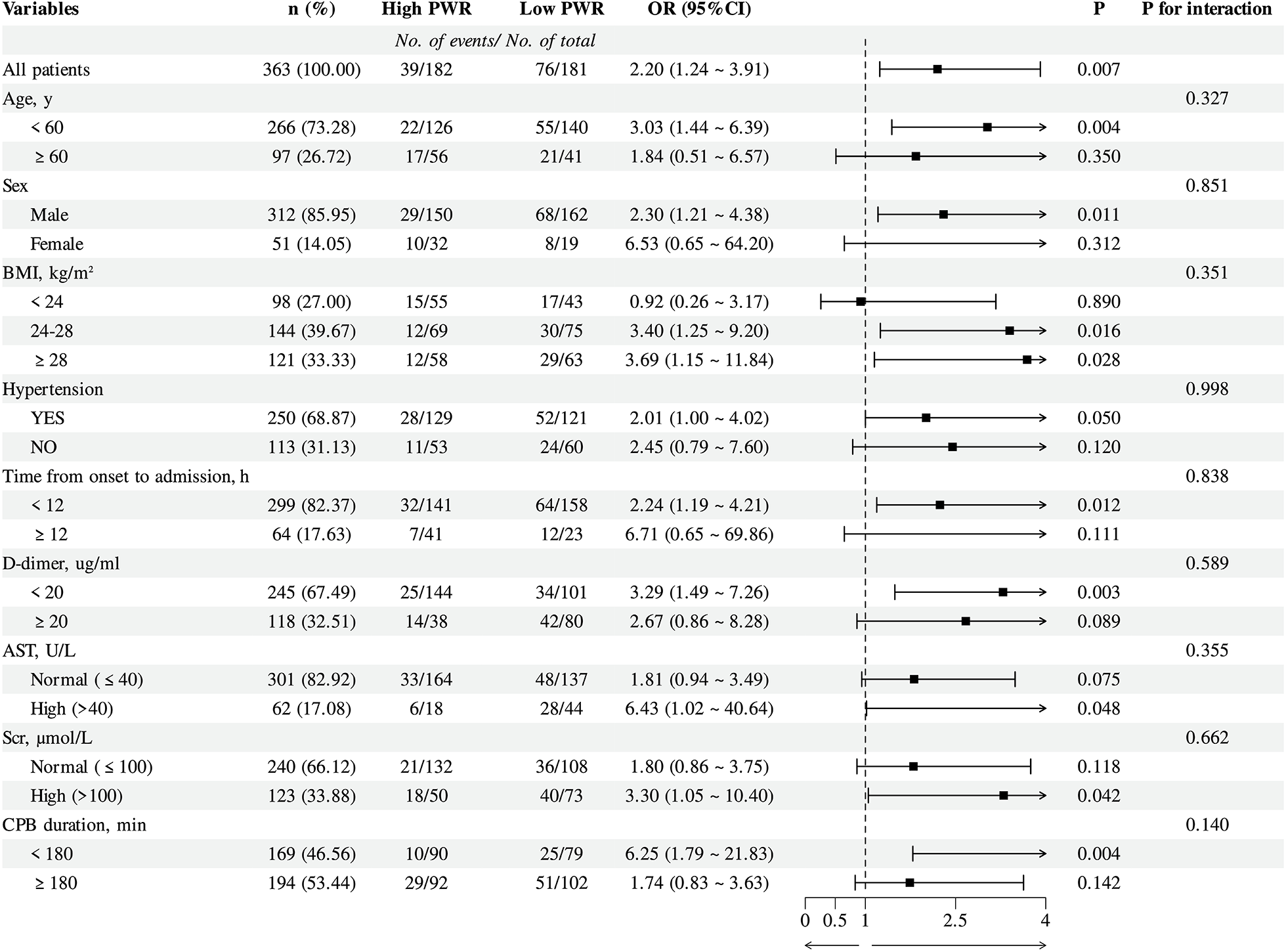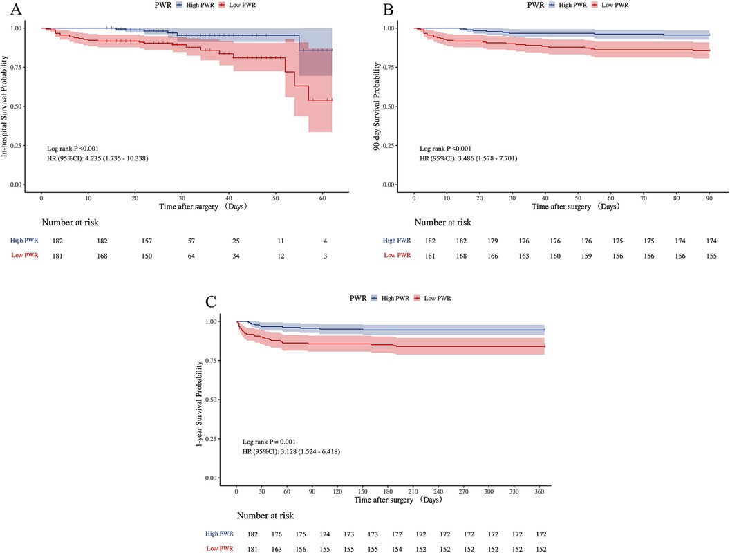 All patients were assigned to two groups as per the median PWR: the low PWR group (<13.259, n = 181) and the high PWR group (≥ 13.259, n = 182). As shown in Table 1. Patients in the Low PWR group had higher proportions of preoperative hypotension and MPS, and had a significantly shorter time from symptom onset to admission. The WBC, hemoglobin, ALT, AST, SCr, PT, Fibrinogen, D-dimer, Hs-cTn, and Myoglobin levels were remarkably higher in the low PWR group, while the PLT and CRP level between the two groups was the opposite, and the difference was statistically significant.