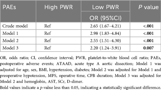 Statistical analysis was statistically quantified via SPSS v25.0 and R software v4.3.3. Continuous data are presented as mean ± SD (normally distributed) or median (IQR) (non-normally distributed), compared using Student's t-test or Mann–Whitney U-test, respectively. Categorical variables are summarized as percentages and analyzed by χ² test. Patients were stratified into low and high PWR groups based on the median value to ensure balanced group sizes. Receiver operating characteristic (ROC) curve analysis was initially used to examine the discriminative ability of PWR in predicting PAEs among patients with ATAAD. The association between the PWR and PAEs was evaluated using a series of multivariable logistic regression models. A stepwise selection algorithm based on the Akaike Information Criterion (AIC) was employed to optimize model parsimony and performance. To avoid multicollinearity, variables with a variance inflation factor (VIF) ≥ 5 were excluded. The modeling strategy comprised a crude (unadjusted) model, followed by sequentially adjusted models: Model 1 (demographics and comorbidities: age, sex, BMI, hypertension, diabetes); Model 2 (Model 1 + clinical and operative factors: preoperative hypotension, MPS, operative time, CPB duration); and Model 3 (Model 2 + laboratory markers: hemoglobin, AST, SCr, D-dimer). Subgroup analyses (age, sex, BMI, hypertension, time from symptom onset to admission, AST, SCr, D-dimer and CPB duration) assessed effect modification, testing interactions for significance. Kaplan–Meier survival analysis was employed to construct survival curves, with comparative analysis between groups using the log-rank test. The association between PWR and short- and mid-term postoperative mortality was further evaluated using Cox proportional hazards regression analysis. A value of p < 0.05 was considered to be statistically significant.