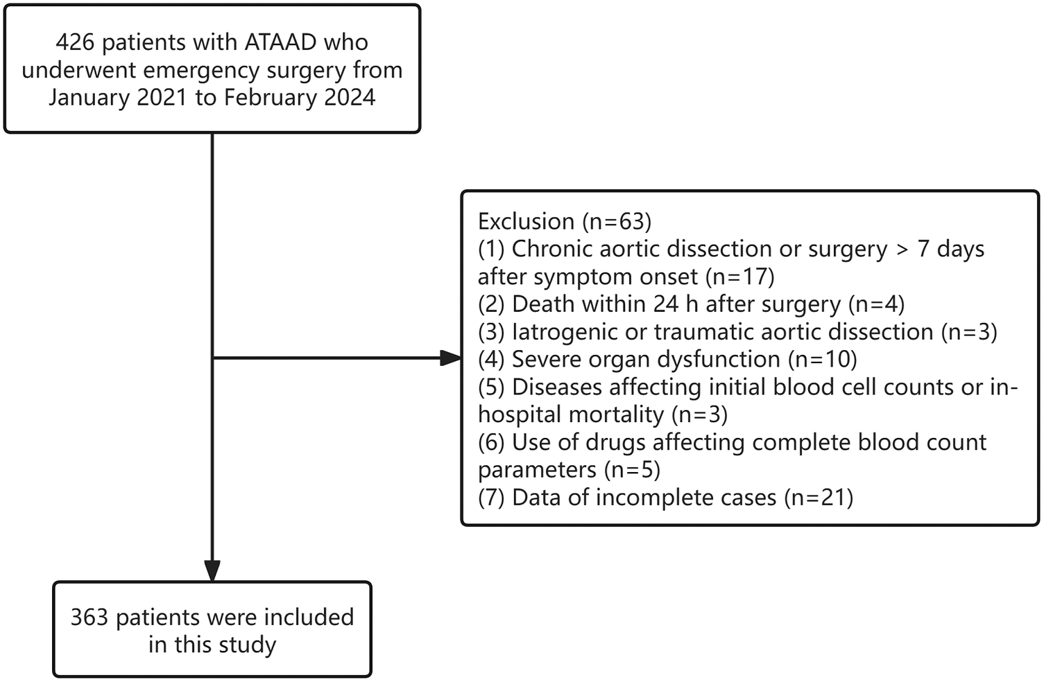Approximately 426 patients diagnosed between January 2021 and February 2024 were initially assessed for eligibility. Exclusion criteria were applied to 17 patients with chronic aortic dissection, four individuals died within 24 h postoperatively, three cases involving iatrogenic or traumatic aortic dissection, ten patients presenting with severe organ dysfunction, three patients with conditions affecting baseline hematological parameters or associated with in-hospital mortality, five cases with the use of drugs affecting CBC values, and 21 patients with incomplete clinical records. After these exclusions, 363 patients were ultimately enrolled in the analysis (Figure 1). Of these, 312 were men (85.95%) and 51 were women (14.05%). The median age was 50 years, and hypertension emerged as the most prevalent comorbidity (68.87%).
