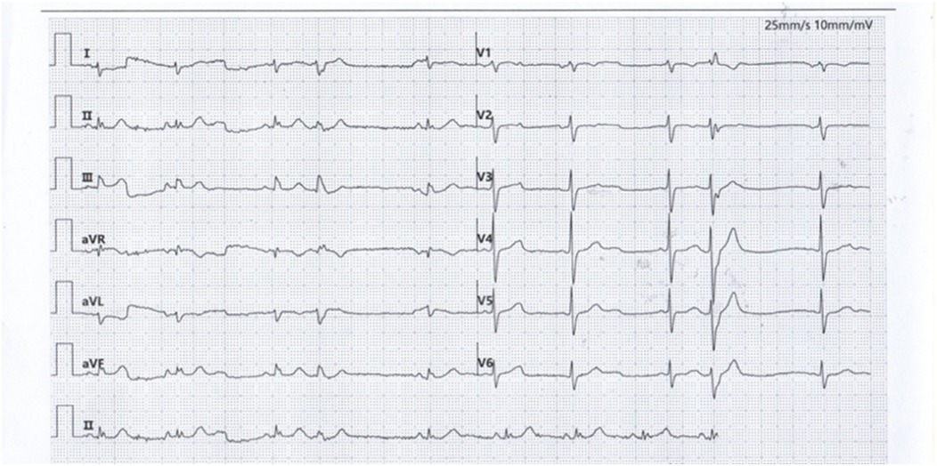 The patient was a 66-year-old male referred to our medical institution due to palpitations. He was diagnosed with idiopathic ventricular premature beats (VPBs) via ambulatory electrocardiogram (ECG) recording, with a VPB burden of 34.3% (26,949/78,629). The patient had no history of organic heart disease, diabetes mellitus, chronic kidney disease, or coronary artery disease. Medical therapy for VPB control was limited, so catheter radiofrequency ablation for VPBs was performed. Preoperative ECG morphology of VPBs suggested the origin of premature beats was the left ventricle (LV) (Figure 1). The VPBs showed a right bundle branch block (RBBB) morphology with transition starting at V2, suggesting a possible origin from the LV apex. The preoperative cardiac ultrasound and left ventricular myocardial contrast echocardiography did not indicate any abnormalities in the left heart structure (Supplementary Figures SA,B).