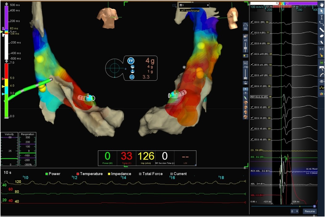 Figure 2. Target three-dimensional mapping image and ablation parameter curve graph: the green curve represents power, red represents temperature, and yellow represents impedance.