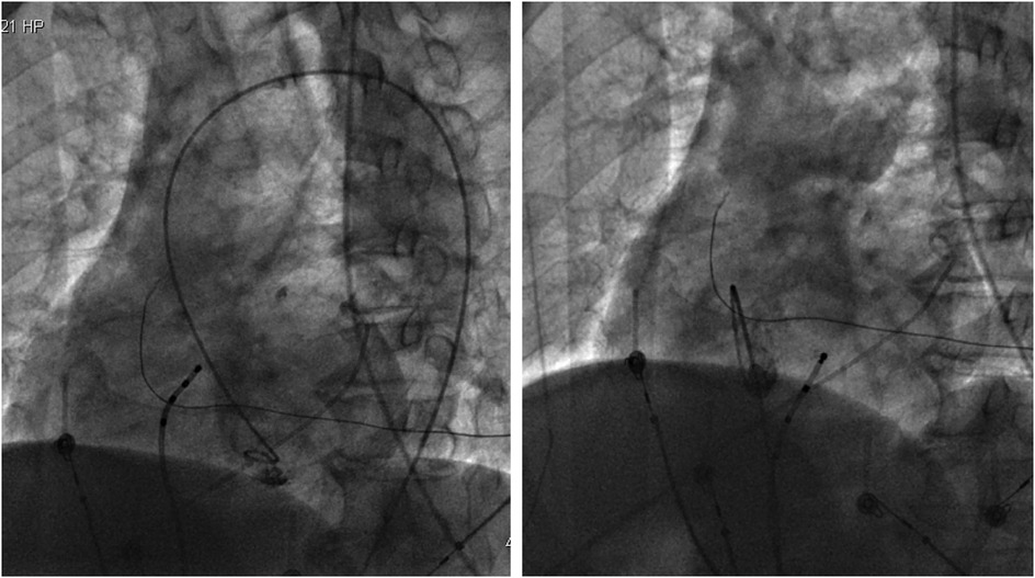 With the radiofrequency ablation power set at 30–40 W and the target temperature at 55 °C, the radiofrequency transmission lasted up to 90 s (Figure 2). During the ablation process, steam pop was not perceived, and there were no sudden changes in ablation parameters such as impedance、power or pressure values (Figure 2). After the termination of radiofrequency, the ventricular premature beats were significantly reduced. During the observation period after ablation (not immediately after), the patient suddenly complained of chest tightness, shortness of breath, and chest pain, and the blood pressure dropped to 102/65 mmHg (baseline blood pressure value: 149/78 mmHg). x-ray fluoroscopy observation showed a translucent shadow around the heart in the pericardial cavity (Figure 3), and the patient was suspected of having pericardial tamponade. Pericardial puncture and drainage were immediately performed. After slowly withdrawing 150 ml of bright red blood, no more blood was withdrawn, and the patient's blood pressure gradually recovered and tended to be stable. The ACT value immediately before pericardiocentesis was 126 s. Protamine was not administered and no additional heparin was administered due to the short duration of ablation. The unexpectedly low ACT at the time of pericardiocentesis may reflect partial heparin metabolism and consumption. Blood gas analysis of the red blood cells drawn from the pericardium suggested arterial blood. Under fluoroscopy, the translucent zone around the heart was smaller than before. In order to further clarify the perforation site, angiography was performed in the left and right ventricles(Supplementary Videos S1–S4), and it was found that the contrast agent did not extravasate outside the cardiac cavity (Figures 4A,B). Bedside transthoracic echocardiography showed that the pericardial effusion did not further increase. After indwelling the pericardial drainage tube, the patient was returned to the cardiac care unit for further observation. After 1 day of continuous drainage, no effusion was drained, and continuous review of echocardiography showed no obvious effusion (Supplementary Figures C,D). The patient was discharged after the drainage tube was removed.