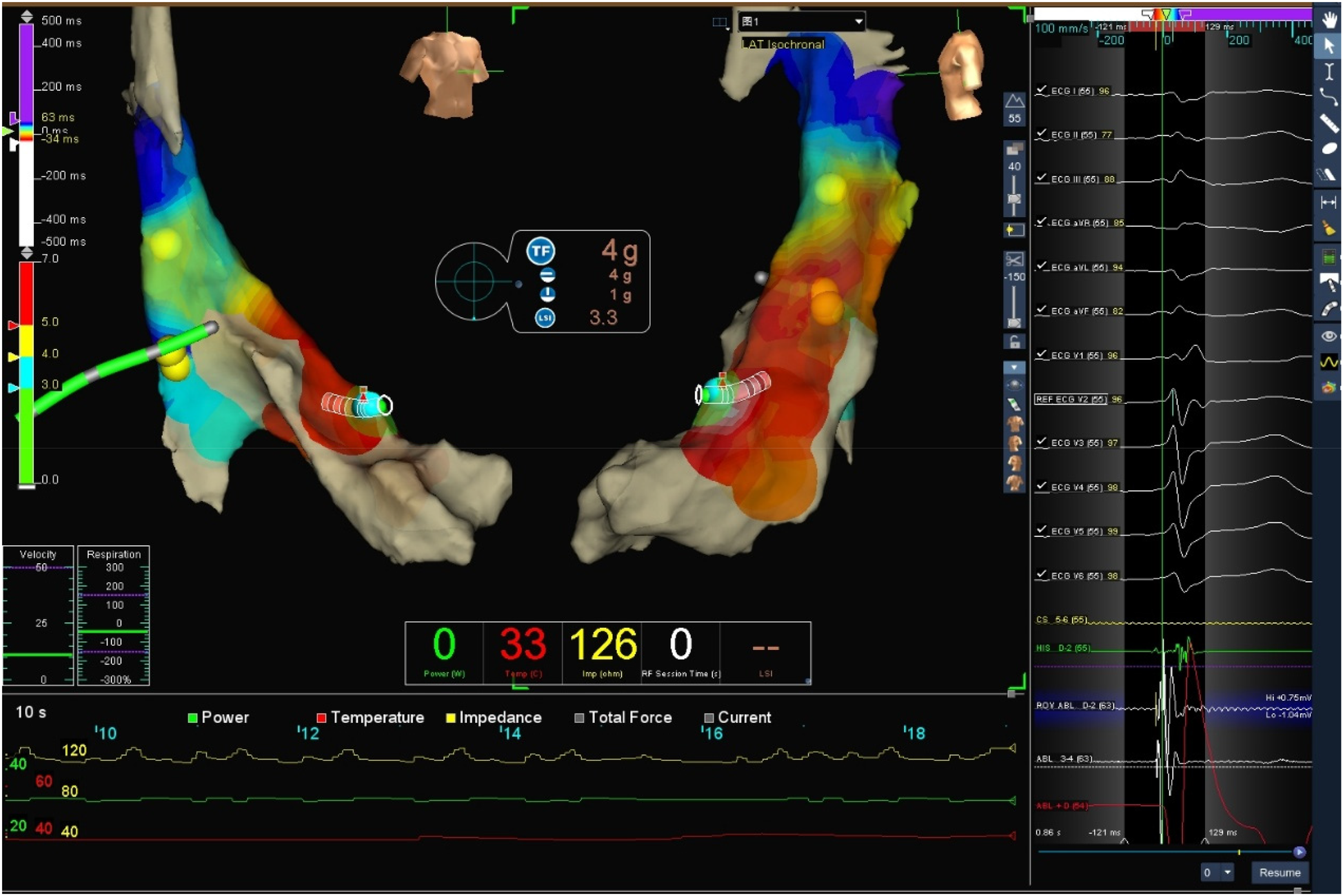 Target three-dimensional mapping image and ablation parameter curve graph: the green curve represents power, red represents temperature, and yellow represents impedance.