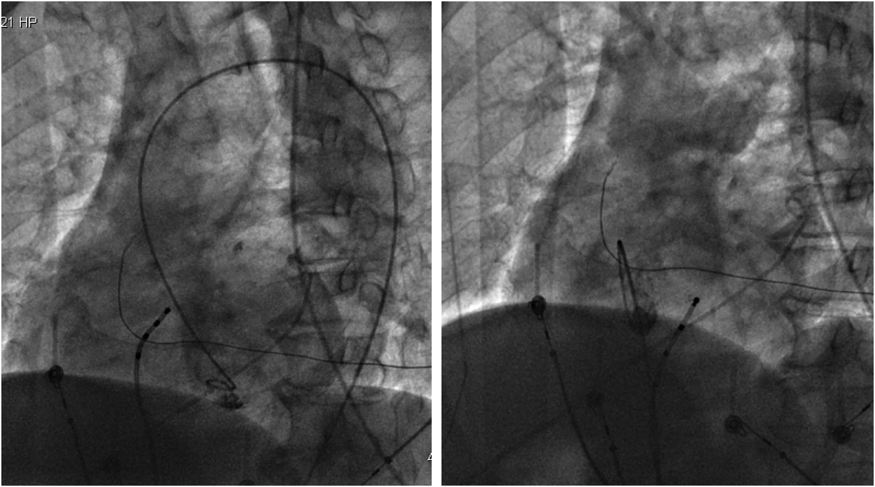 (Left) Left ventricular angiography showing no contrast agent extravasation into the pericardial cavity. (Right) Right ventricular angiography showing no contrast agent extravasation into the pericardium.
