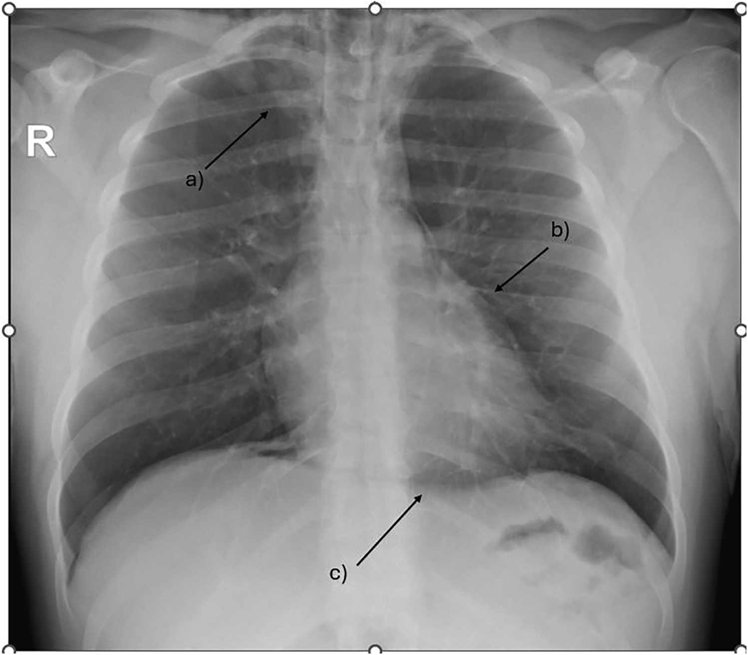 Chest x-ray showing massive pneumomediastinum tracking up to the base of the neck. (a) subcutaneous emphysema (b) extra pleural air sign (c) the continuous diaphragm sign.