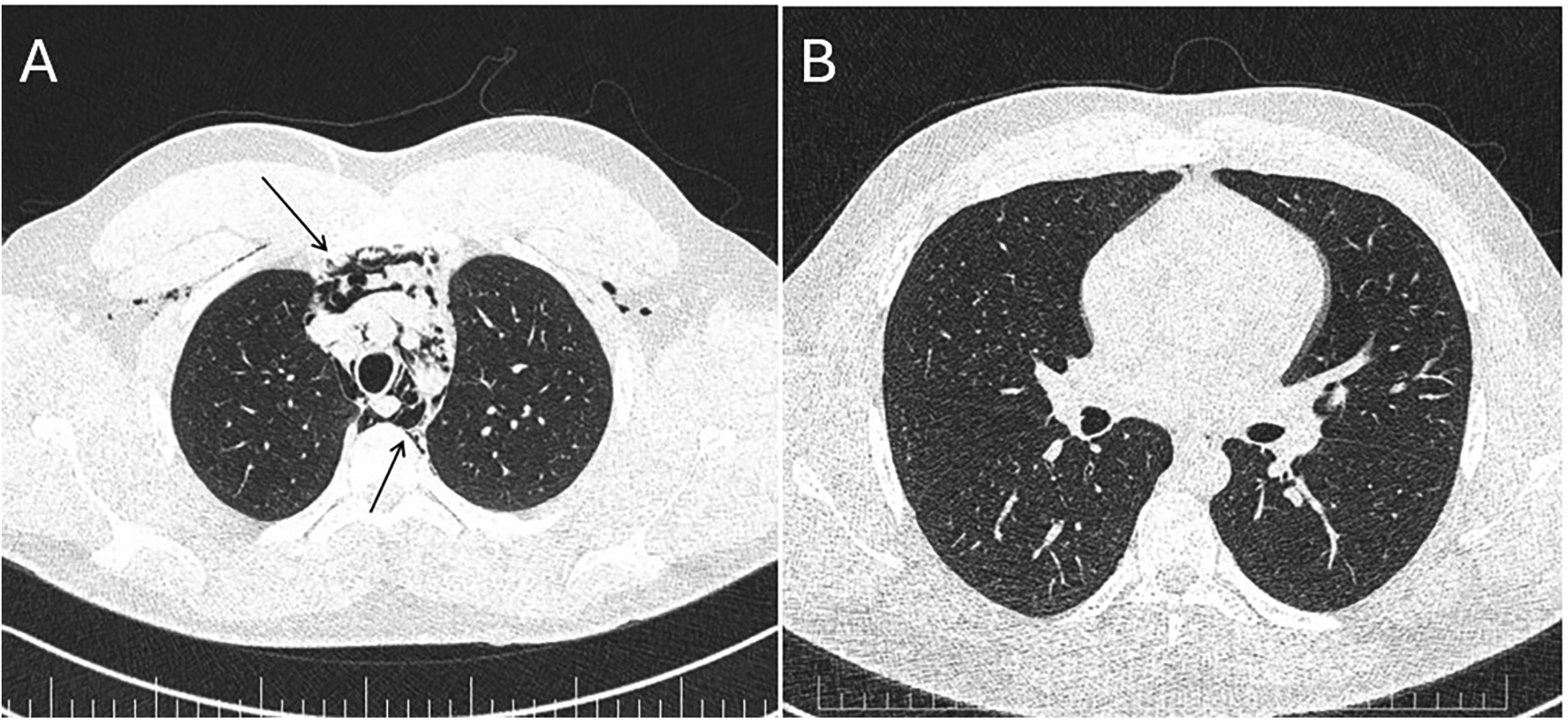 Panel (A) CT scan—massive pneumomediastinum—lung window demonstrating air in the anterior chest wall (upper arrow) and in the mediastinum (lower arrow). Panel (B) Repeat CT scan 7 days later—almost complete resolution of the pneumomediastinum.