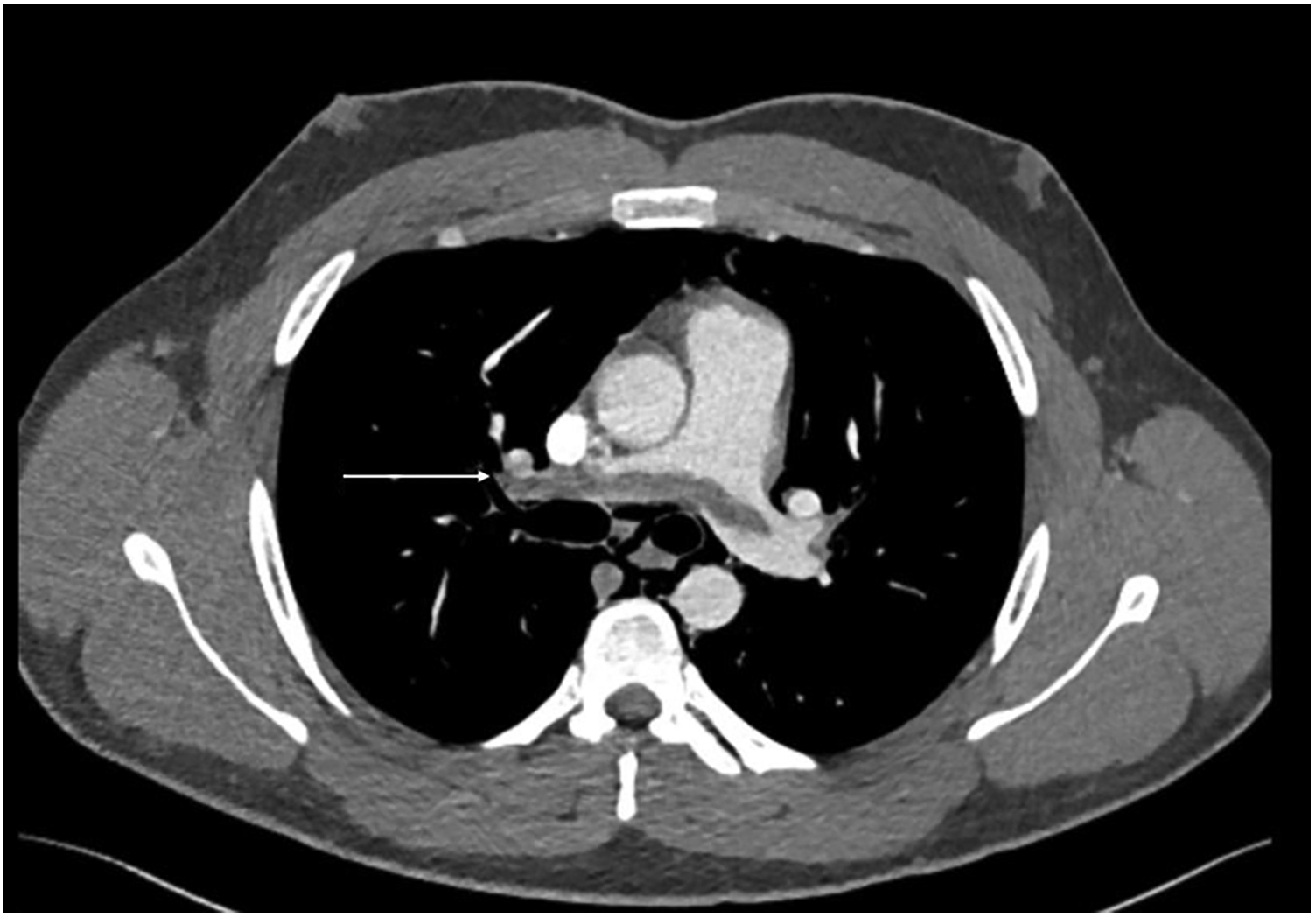 CT scan—CTPA demonstrates saddle pulmonary embolism extending to subsegmental branches bilateral (arrow demonstrates a large thrombus extending across the pulmonary artery bifurcation).