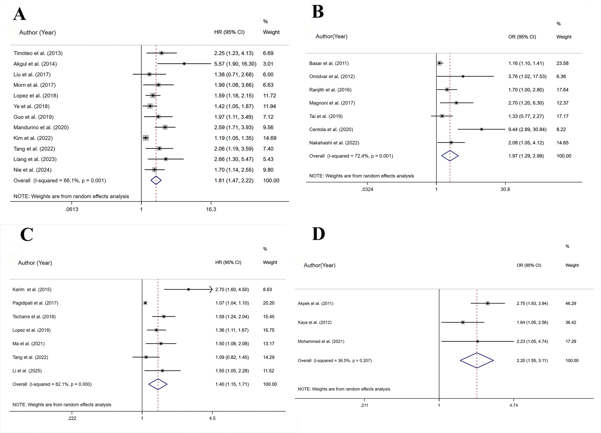 Meta-analysis on the prognosis of ACS patients with HSUA and Non-HSUA groups. (A) All-cause mortality(HR). (B) All-cause mortality(OR). (C) MACE(HR). (D) MACE(OR).