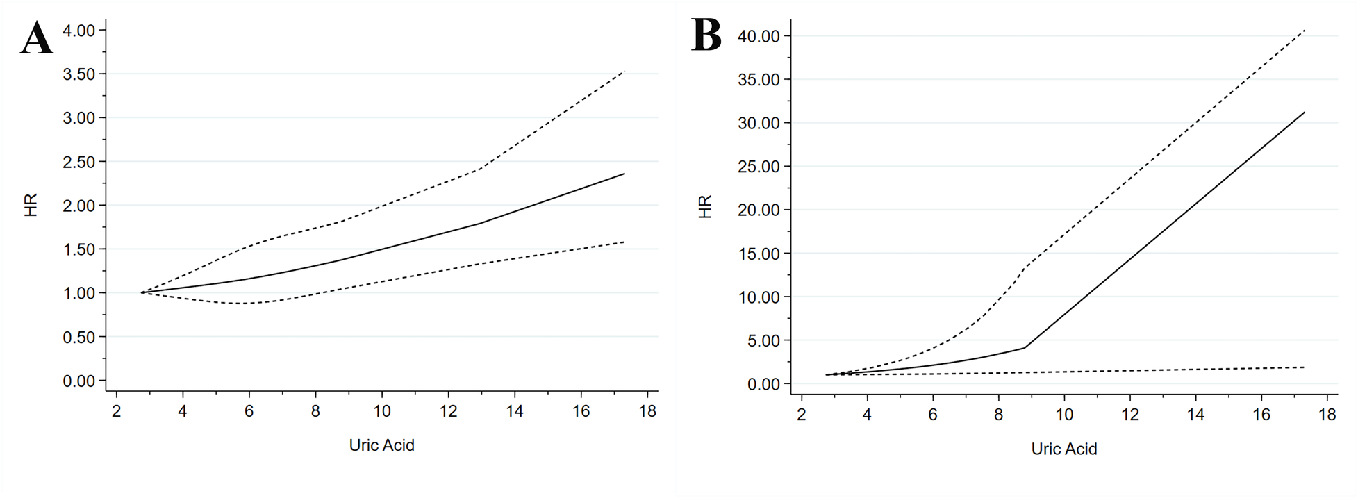 HSUA level is strongly associated with poor clinical outcomes in ACS patients, including mortality and major cardiovascular events. Given the nonlinear relationship with mortality, SUA could serve as a potentially valuable clinical marker. However, further multicenter studies are needed to confirm these findings.