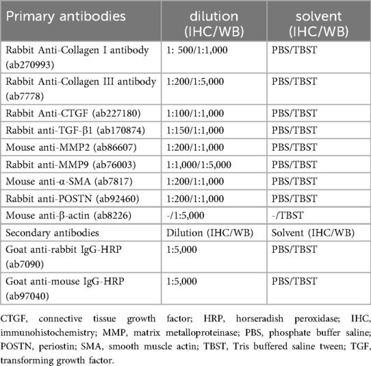 Total protein samples were prepared from the atria using RIPA lysis buffer (CWBIO, China) mixed with 1% PMSF. After the cell lysates were centrifuged, the supernatant containing protein was collected and boiled at 95°C for 10 min. The protein samples were subjected to 10%–15% SDS–PAGE and transferred to a polyvinylidene fluoride membrane (Millipore, USA). Subsequently, nonspecific proteins in the membrane were blocked with 5% nonfat milk, and the target proteins were immunoreacted with primary antibody overnight at 4°C. The membrane was then immersed in a horseradish peroxidase-conjugated secondary antibody for 2 h and subsequently immersed in ECL chemiluminescence liquid (Dingguo Changsheng Biotechnology, Beijing, China). Table 1 lists the primary and secondary antibodies used in this study. The visualized immunoblots of the target proteins were photographed, and their relative expression was analyzed using β-actin as an internal reference.