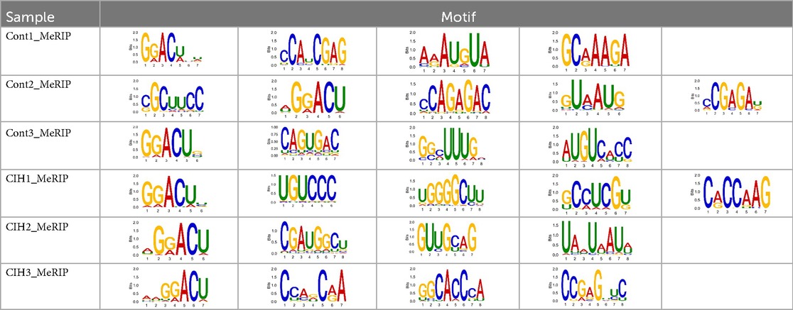The sequencing data were aligned with the reference genome, and the number and length of m6A peaks were confirmed using TopHat software (v2.0.13) (Table 4). The overall length of the m6A peak varied from 1,173,899 bp to 3, 329, 809 bp in the control and CIH samples. m6A peaks were observably related to two distinct coordinates, including the start of the coding sequence (CDS) and the beginning of the 3′ untranslated region (3′UTR) (Figure 3a). The distribution of m6A peaks in the CIH rats and control rats exhibited the same trend, rising from the 5′ untranslated region (5′UTR) to the beginning of the 3′UTR and descending from the beginning of the 3′UTR to the end of the transcriptome. However, the density of m6A of CIH rats in the 3′UTR region was lower than that of the controls (Figure 3a). The m6A peaks were distributed across the chromosomes (Figure 3b). The control and CIH samples exhibited only 41.32% common peaks (Figure 3c). To methodically assess enrichment, we assigned each m6A peak to one of five non-overlapping transcript segments. As a result, 77.18% of m6A peaks were located within the coding region (introns and exons) (Figure 3d). The m6A motifs concentrated in rats of the control and CIH groups are listed in Table 5.
