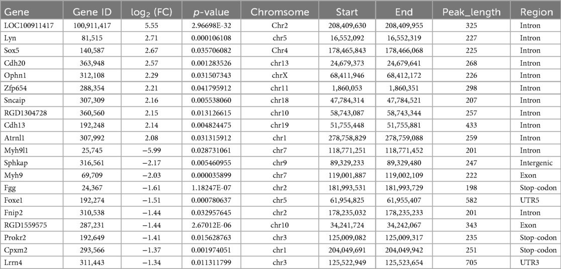 The heat map displayed differential m6A methylation peaks in CIH and control atrial tissues (Figure 4a) that included 105 significantly upregulated hyper-methylated m6A peaks and 28 significantly downregulated hypermethylated m6A peaks (fold change >1.3, P < 0.05) (Figure 4b). Table 6 presents the top 20 differential m6A peaks, including the upregulation of LOC100911417, Lyn, Sox5, Cdh20, Ophn1, Zfp654, Sncaip, RGD1304728, Cdh13 and Atrnl1 and the downregulation of Myh911, Myh9, Fgg, Foxe1, Fnip2, RGD1559575, Prokr2, Cpxm2, and Lrrn4. A heat map of differentially expressed transcripts between the control and CIH groups (Figure 4c) included 271 upregulated transcripts and 153 downregulated transcripts (fold change >1.3, P < 0.05) (Figure 4d). Conjoint analysis revealed the co-expression of genes with differential m6A modifications and differentially expressed transcripts, encompassing genes with simultaneous upregulation (10 genes, including Vash2, Angptl4, Slc25a34, Tubb3, Stmn3, Adgra1, LOC102550048, Uchl1, Adgra1, and Lnc215) (Table 7) or downregulation (24 genes, Table 8) and genes with opposite trends (Figure 4e).