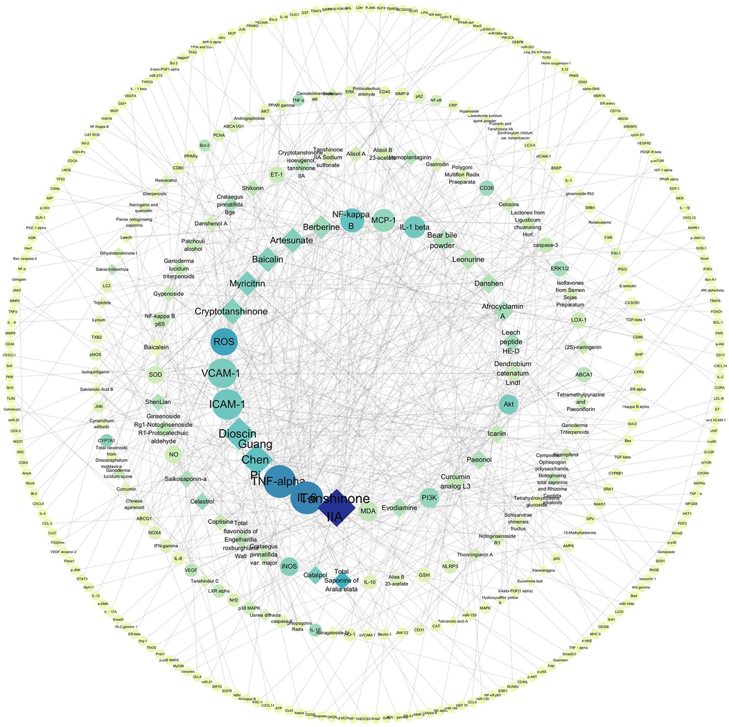 The vascular endothelium is the continuous cellular lining of the cardiovascular system and is a key link in the development of numerous vascular problems, such as vascular tone, thrombosis, VSMC proliferation, leukocyte adhesion, and vascular inflammation. In recent years, endothelial function impairment has been found to be the primary and earliest link in the development of AS. The earliest manifestation of AS is impaired diastolic function when there are no microscopically visible lesions in the endothelium or vascular wall, and the only changes are decreased release of nitric oxide (NO), increased peroxides, and increased oxygen ions, which are only signs of functional damage. Additionally, as a mechanical barrier between the vessel wall and plasma molecules, the endothelium plays a crucial role in maintaining vascular status, and endothelial cell dysfunction (ECD) is a major contributing factor to the progression of atherosclerotic plaques in the early stages of AS (122). The recruitment of inflammatory cells, which in turn leads to an inflammatory response in the vasculature, is an important factor leading to endothelial cell damage and dysfunction. Fortunately, many Chinese medicines have therapeutic effects on vascular damage and related inflammatory conditions.