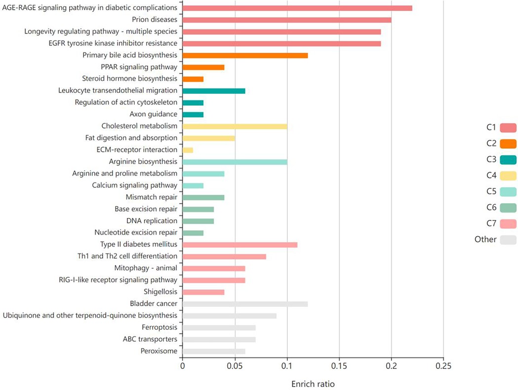 The validation targets were enriched in GO biological processes, and a total of 207 terms were enriched, of which 30 terms were significantly enriched (Figure 3). Among them, the most obviously enriched pathways were the AGE-RAGE signaling pathway in diabetic complications, prion diseases, the longevity regulating pathway in multiple species, EGFR tyrosine kinase inhibitor resistance, and the adipocytokine signaling pathway. Through the description of these five terms by KEGG, we can learn that the main functions of these terms are related to inflammation, glucose metabolism, lipid metabolism, autophagy, and apoptosis, which often profoundly affect the generation and development of AS. The AGE-RAGE signaling pathway in diabetic complications activates several intracellular signaling pathways that can lead to NF-κB activity. NF-κB promotes the expression of a series of proinflammatory cytokines and various atherosclerosis-related genes, such as VCAM-1, VEGF, and RAGE. In addition, the AGE-RAGE signaling pathway is involved in cell proliferation and apoptosis in diabetic patients. Pathways of action in prion diseases include oxidative stress, the regulatory activation of complement, the corticosteroid response and endoplasmic reticulum stress. In longevity-regulating pathways, multiple species are involved in antioxidative stress, energy metabolism, DNA damage repair, glucose metabolism, autophagy, and other processes, thus resisting molecular, cellular, and organ damage; preventing the loss of various functions of human tissues; and reducing the risk of disease and death. EGFR can effectively interfere with the growth, differentiation, and proliferation of vascular cells. The adipocytokine signaling pathway is an important regulatory pathway for energy intake and metabolic rates. This function is due mainly to JAK kinase activity, STAT3 phosphorylation, and activation of AMPK to inhibit endogenous glucose production. In addition, JNK, mTOR, and IKK have also been shown to be involved (Figure 4).