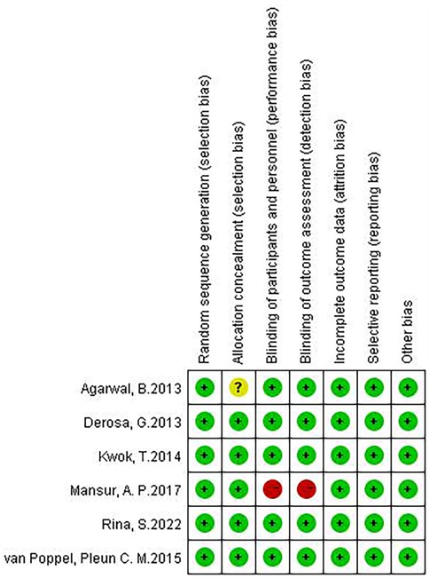 Although there are few clinical studies on Chinese medicines for the treatment of AS, we still found 6 relevant clinical research articles in addition to a large number of in vivo and in vitro studies in the course of our systematic review. These six articles focus on studies that address AS or AS-related high-risk factors, such as inflammation, lipids, and glucose. We then conducted an in-depth evaluation of these six articles. All studies were designed with at least one experimental group and one control group. Patients in the experimental group were treated with one or more single herbal medicines or natural compounds. Patients in the control group received only placebo or conventional treatment, which included exercise and lifestyle modification. All six included studies randomized patient groups, and the method of random assignment had a low impact on trial outcomes and was rated as “low risk”. Five studies had no risk of bias in allocation concealment and were rated as “low risk”, whereas one study did not explicitly mention allocation concealment and was rated as “unclear”. Five studies specified that double-blinding was used during the study to avoid implementation bias and detection bias and were rated as “low risk”, whereas one study did not mention blinding according to the article description and was rated as “high risk” for implementation bias and detection bias. Six studies were rated as “low risk” for the presence or absence of complete reporting of data-complete outcome indicators. All six studies were rated as “low risk” for selective reporting. No other risk of bias was found in any of the six studies, and they were rated as “low risk” (Figures 5, 6).