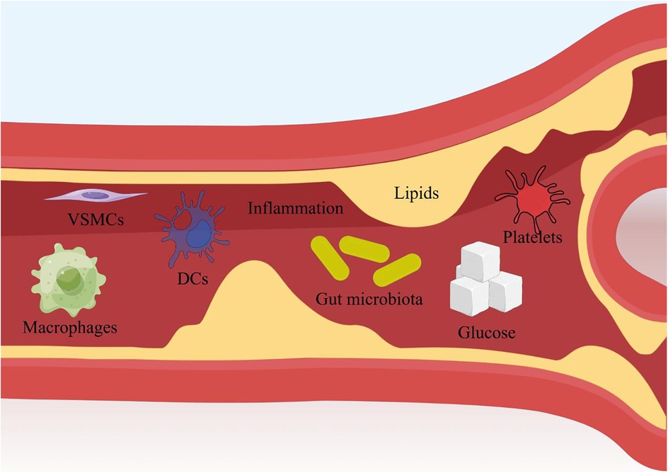 Introduction: Atherosclerosis (AS) is a chronic inflammatory metabolic disease strongly associated with risk factors, including hypertension, hyperlipidemia, hyperglycemia, and hyperuricemia. AS serves as the pathological foundation for numerous cardiovascular diseases (CVDs), and it remains a major threat to global health. However, the underlying mechanisms driving AS development are incompletely understood. Elucidating the pathogenesis and key influencing factors of AS is critical for identifying novel preventive strategies and therapeutic approaches.