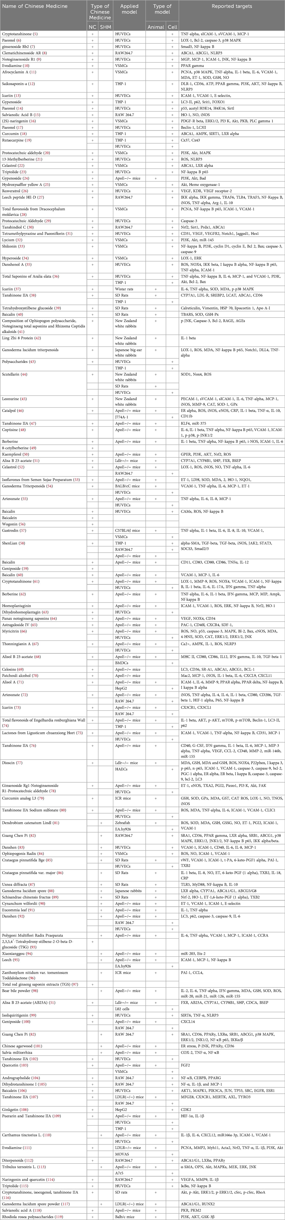 AS, atherosclerosis; CVDs, cardiovascular diseases; TCM, traditional chinese medicine; SHMs, single herbal medicines; NCs, natural compounds; TC, total cholesterol; TG, triglycerides; AGEs, advanced glycation end products; ICAM-1, intercellular adhesion molecule-1; VCAM-1, vascular cell adhesion molecule-1; MCP-1, monocyte chemoattractant protein-1; AGEs, advanced glycation end products; NO, nitric oxide; ECD, endothelial cell dysfunction; PECAM-1, platelet-endothelial cell adhesion molecule-1; DCs, dendritic cells; D&G, Danshen (Salvia miltiorrhiza) and Gegen (Radix puerariae); IMT, intima-media thickness.