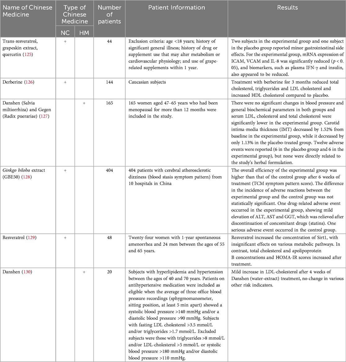 127. Kwok T, Chung LP, Lam C, Ho S, Kwok WC, Fai CK, et al. A randomized placebo controlled trial of an innovative herbal formula in the prevention of atherosclerosis in postmenopausal women with borderline hypercholesterolemia. Complement Ther Med. (2014) 22(3):473–80. doi: 10.1016/j.ctim.2014.03.010