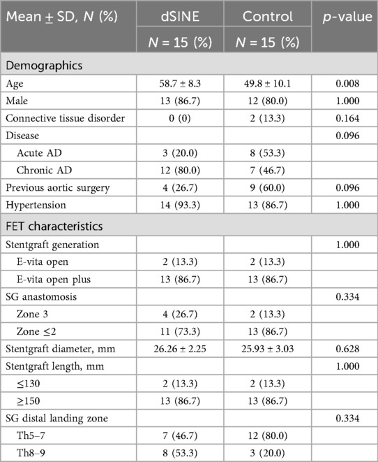 dSINE occurred on average 2.84 ± 2.3 years after the initial FET procedure. In the dSINE group, most patients (80%) initially presented with chronic aortic dissection. Patient characteristics for both groups are summarized in Table 1, showing no significant differences in regard to the implanted FET prothesis (E-vita Open generation or SG length), the location of the anastomosis or the distal SG landing zone. The mean SG diameter was also similar, with 26.26 ± 2.25 mm in the dSINE group and 25.93 ± 3.03 mm in the control group.